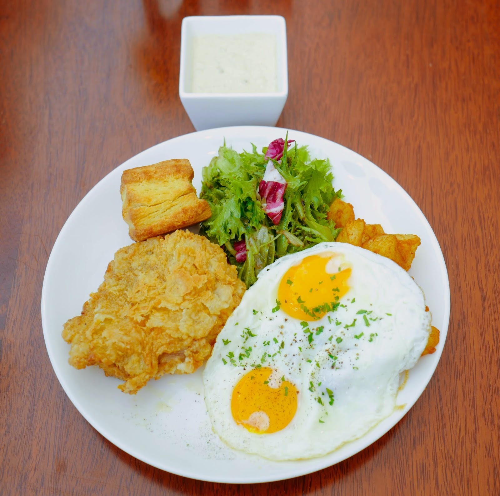 For a more American take on the morning meal, the Southern Fried Breakfast showcases Atlanta-style crispy fried chicken, heaped with a thickly layered buttermilk biscuit, hashed potatoes, eggs and chicken sausage with gravy for enough energy to fuel you long through the afternoon.