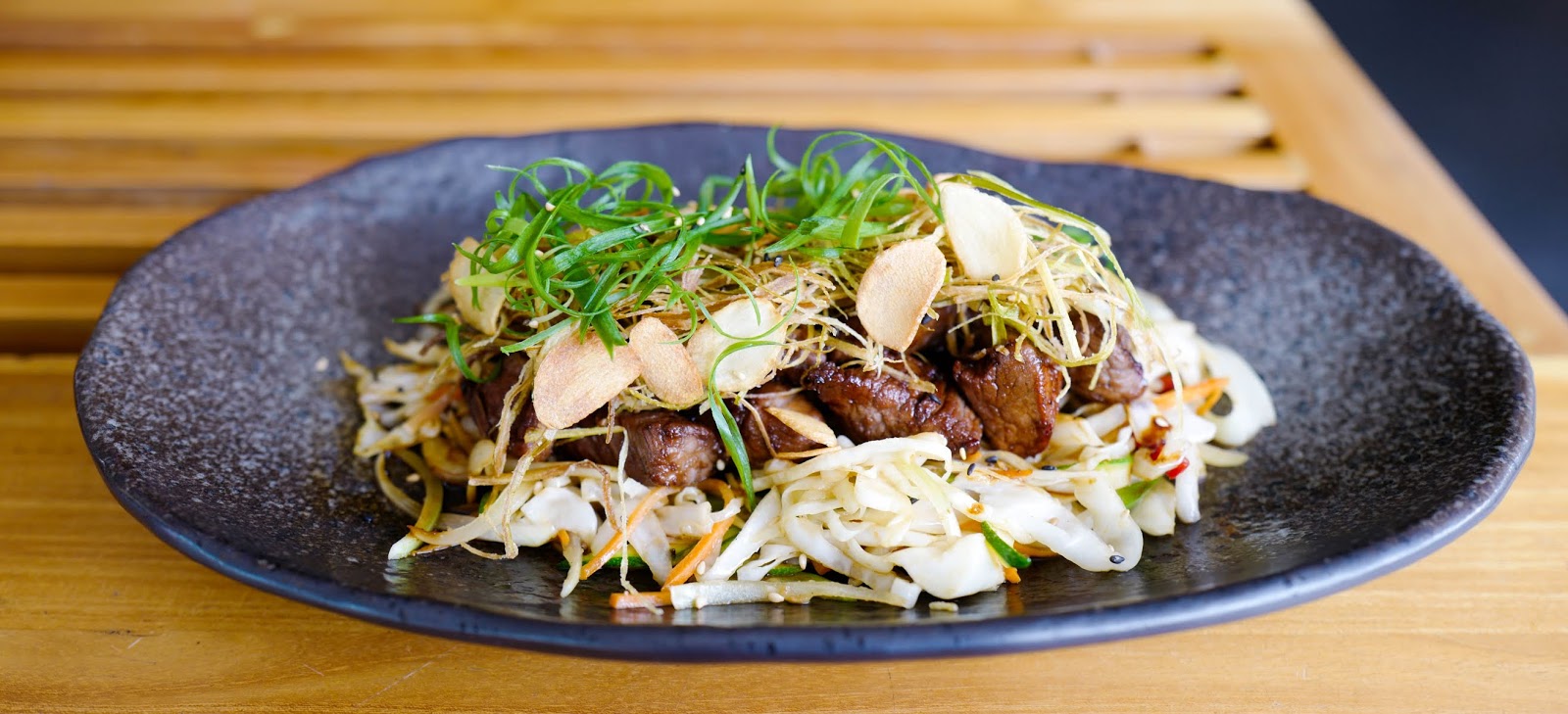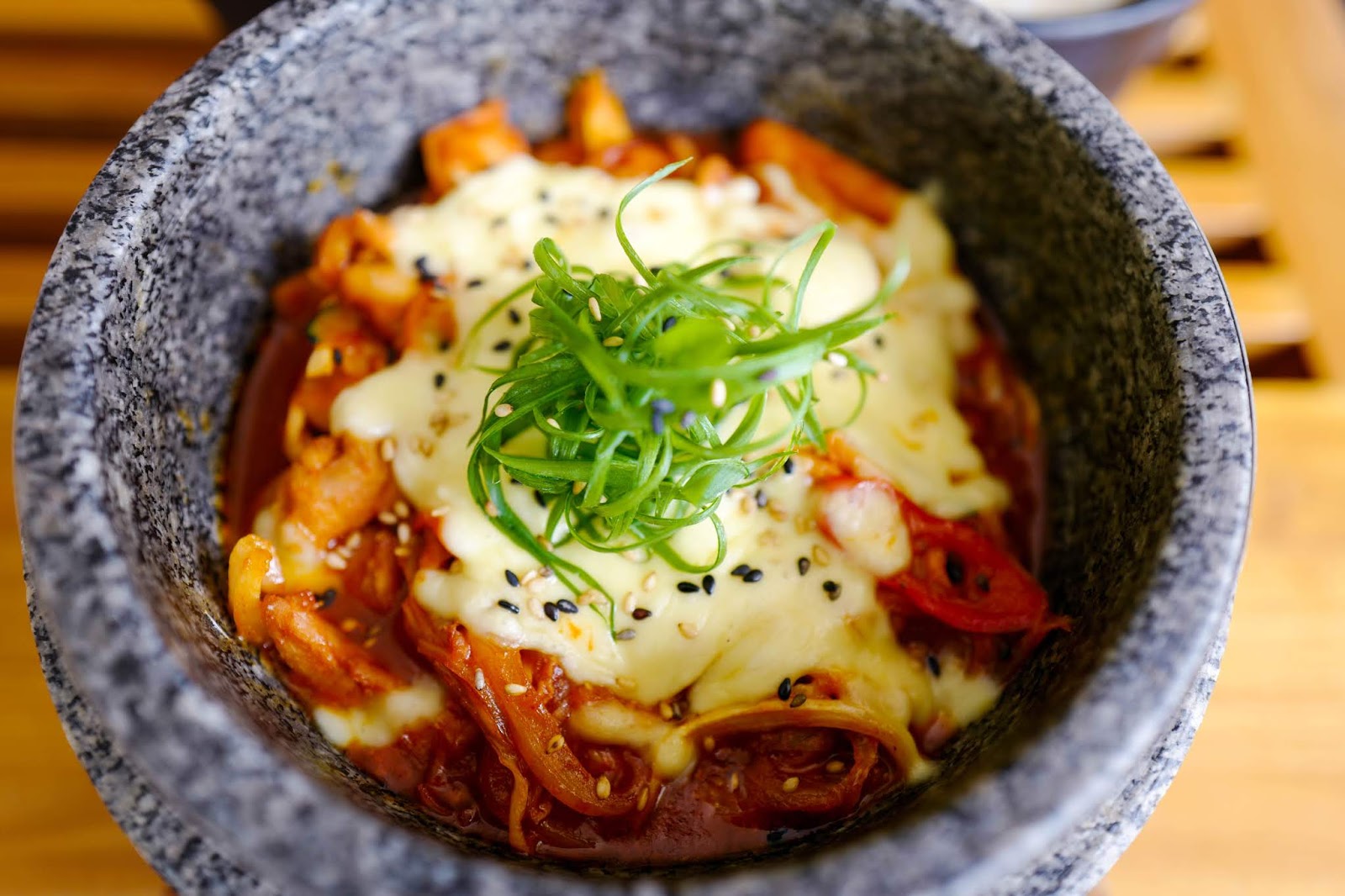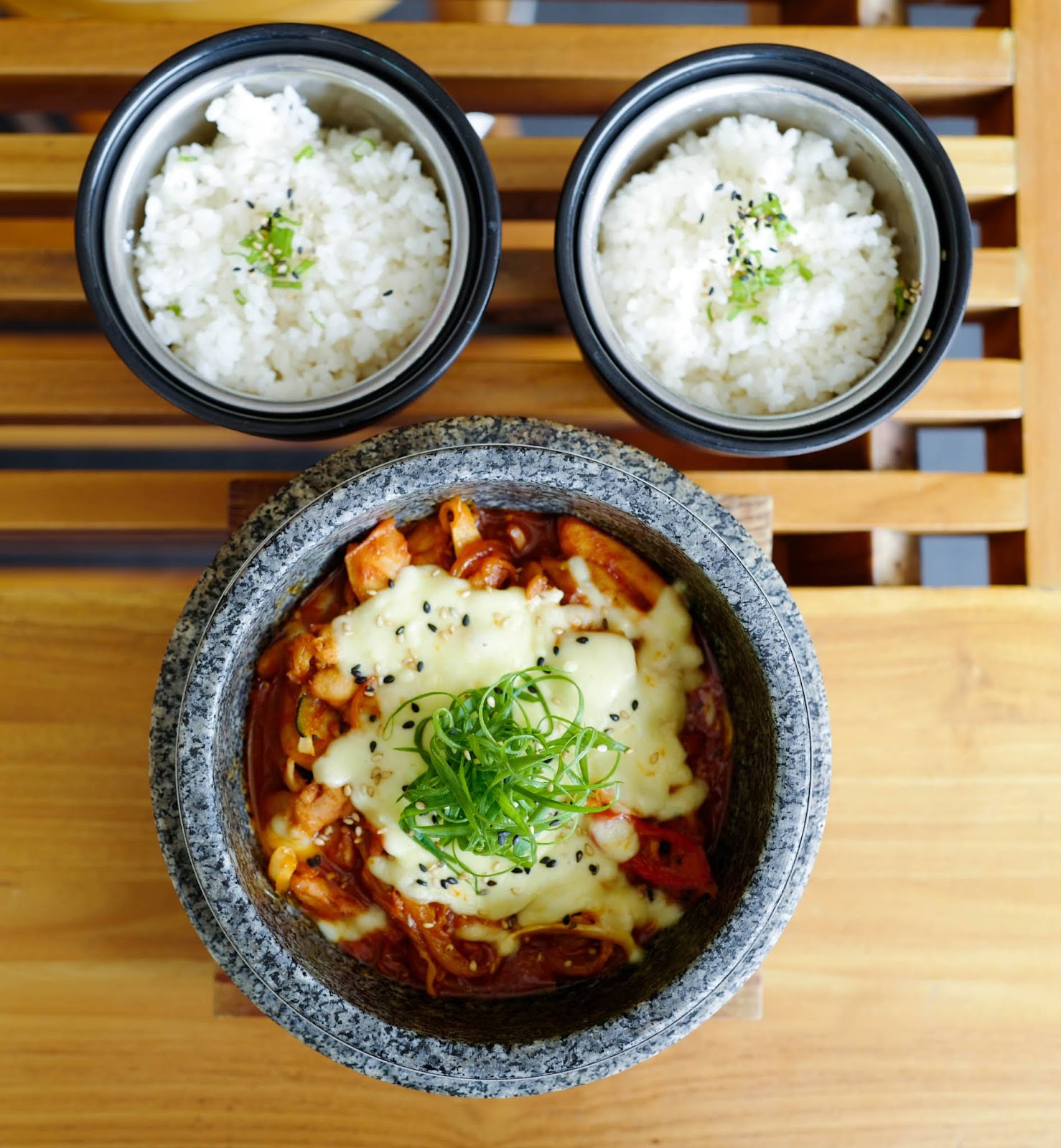 While the menu might seem slanted toward seafood, there's no lack of meat to engage the carnivores: To share, the Gyu-Niku Cube Steak succeeds as an Asian-accented tapa that showcases Australian rib eye beef (RM48), while the Korean Spicy Dak-Bokkeum conceals a Japanese secret - the stone bowl of sauteed chicken layered sinfully with cheese owes its spiciness mainly to Korean gochujang chilli paste, but the dressing has been balanced with Japanese shoyu sauce to mellow out the heat (RM40; served with two steamed rice portions).