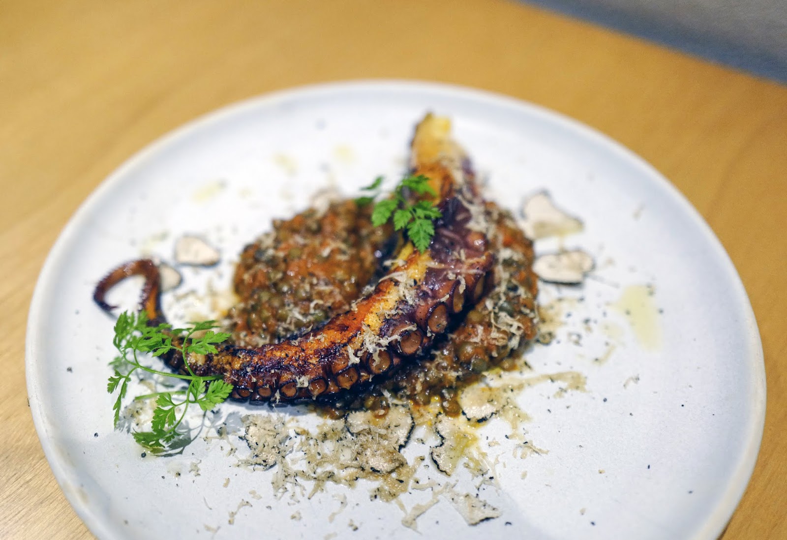 Roost is equally adroit with the ocean and the land, with seafood or fowl, from the Spanish octopus bolstered by puy lentils for treat of succulent, creamy dimensions (RM78; add RM25 for aromatic streaks of Italian shaved truffles), and the Canadian Blue Lobster Roll, with luscious morsels of the crustacean plumply stuffed with sour cream and pistachios in a fresh brioche (RM84) ...