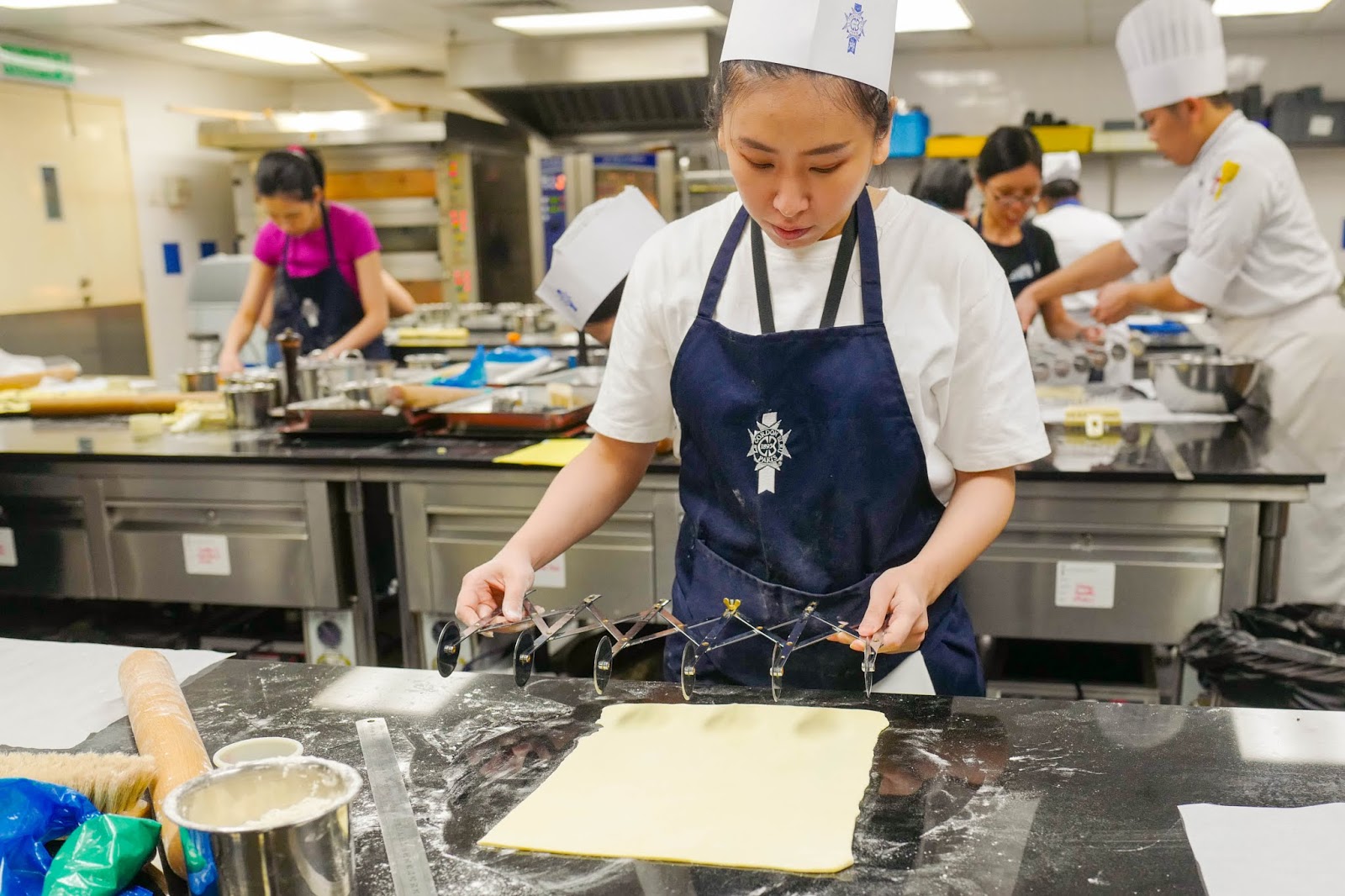 Working with the Le Cordon Bleu kitchen's equipment is a breeze, with the expandable, multi-wheel dough divider, nicknamed the "bicycle," as one shining example. To cut our 31-by-24-centimetre dough into three even layers, we set the bicycle's wheels eight centimetres apart, rolling it forward to accomplish the task effortlessly. Chef Thierry noted we could use knives or a pizza cutter at home, but we'd have to be more careful with our measurements and the slicing for an even distribution.