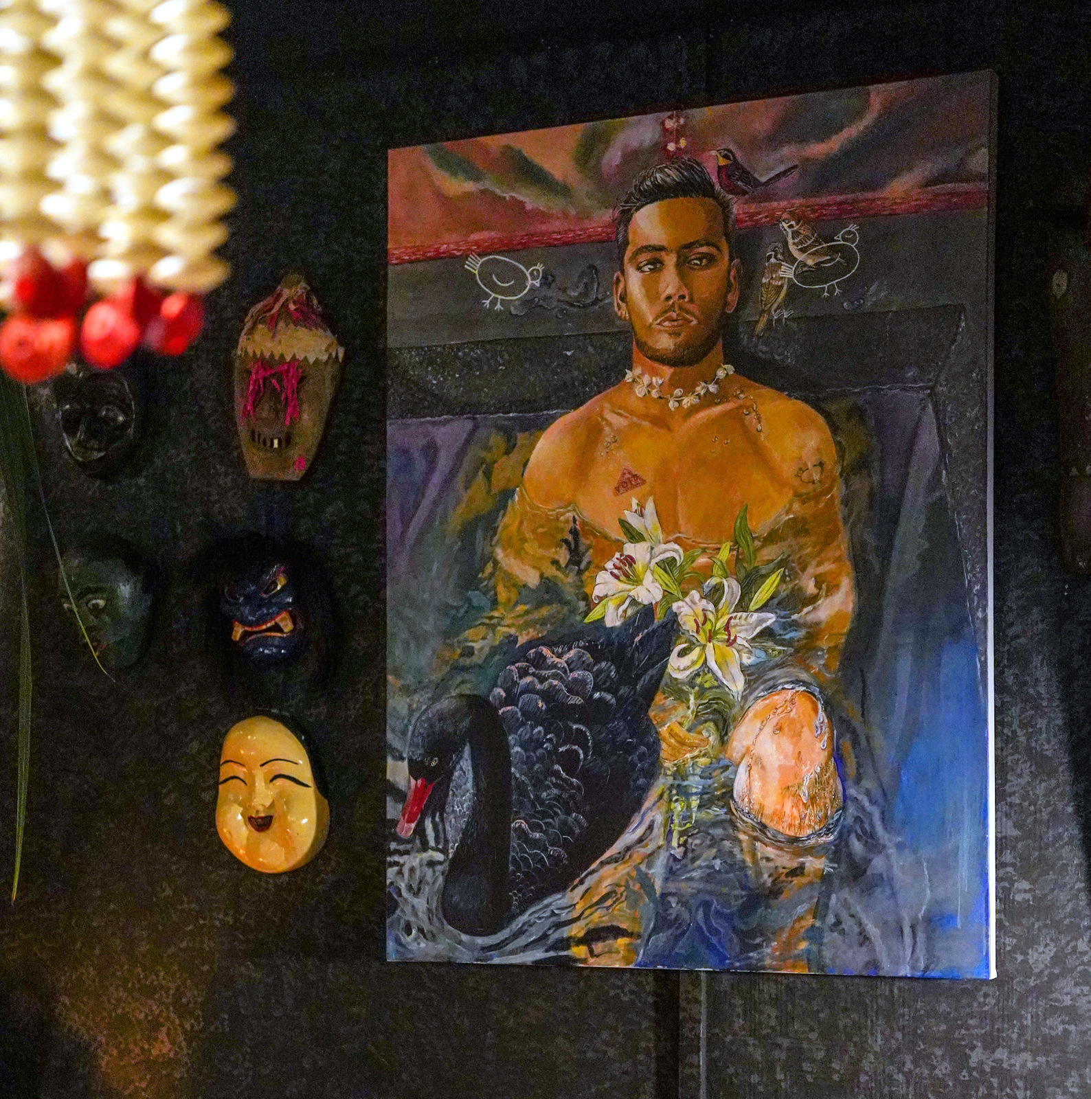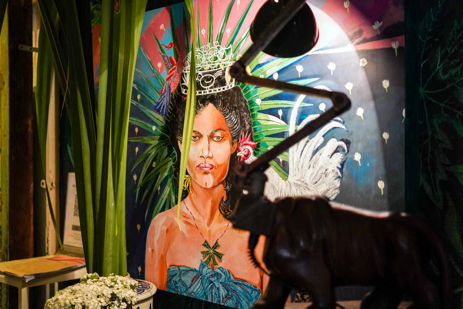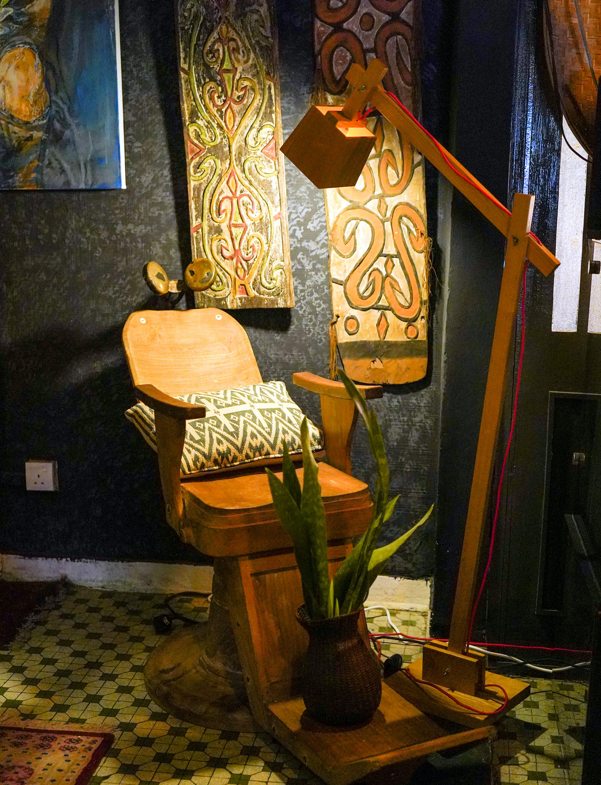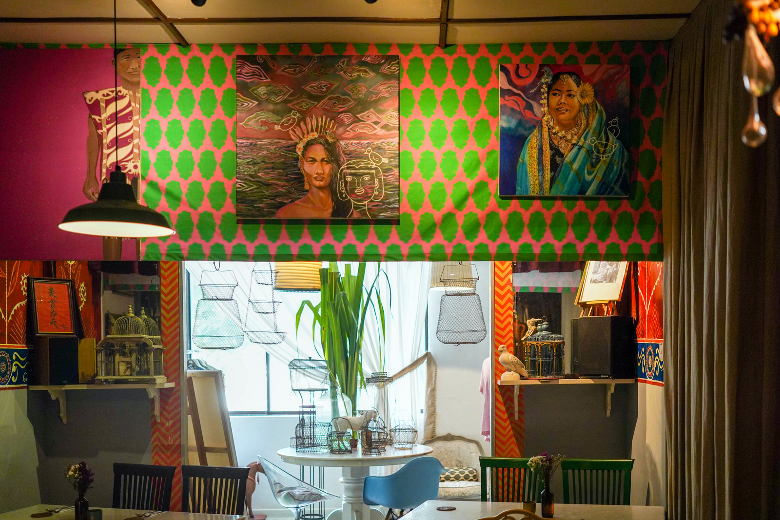 As you enter, two striking portraits embellish ADU Sugar's entrance - one of an elderly, sarong-clad man with a philosophical smile on his lips and a cockatoo on his shoulder; another of a younger, regal-looking woman with a rooster admiring her.