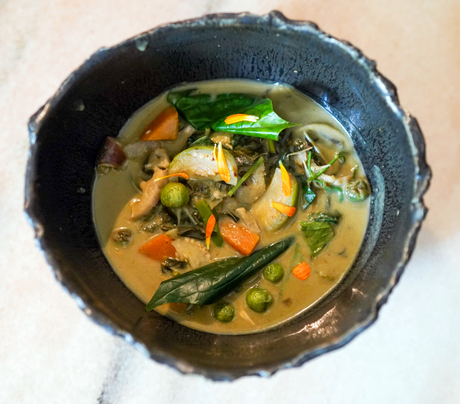 With a farm's full harvest of lotus roots, green aubergines, pea aubergines and butternut squash, coupled with a forest's forage of ulam raja and daun kaduk, and a village's worth of sayur kampung, whole and shredded herbs, this curry tastes truly green - grassy and leafy in a generous form, full-bodied with nature's abundance.