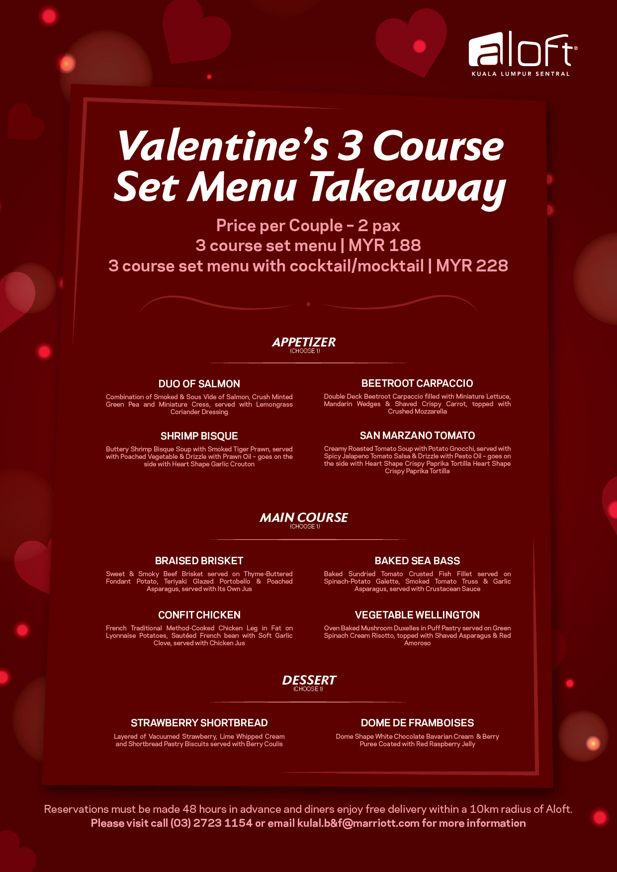 For reservations and more information, please call 603-2723-1154 or email kulal.b&[email protected]