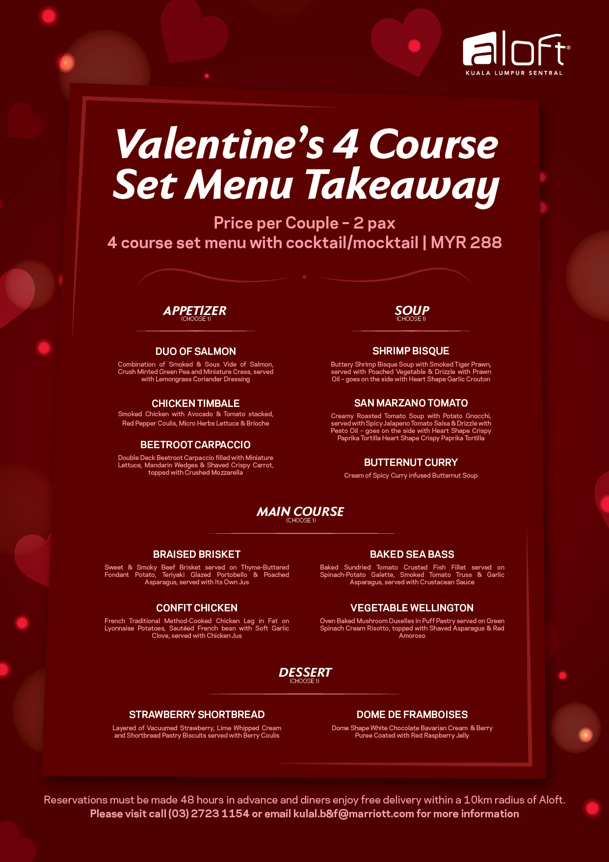 Both menus are available throughout February; reservations must be made 48 hours in advance. Diners will enjoy free delivery within a 10-kilometre radius of Aloft.