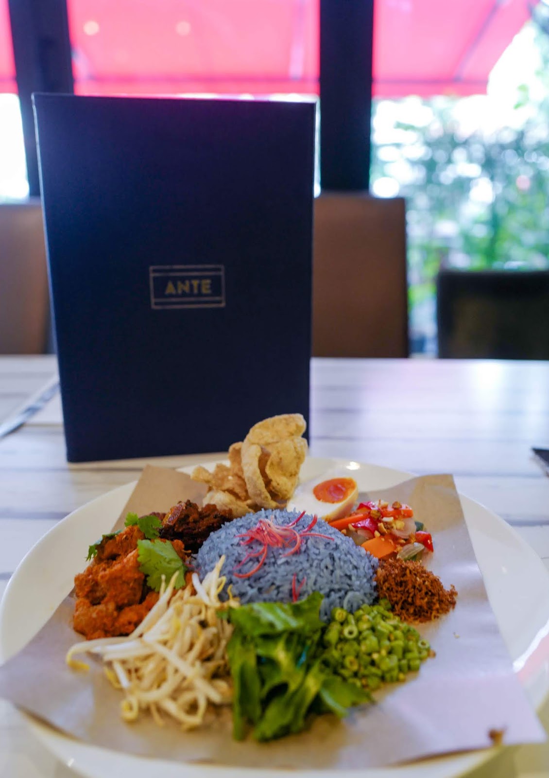 The core of ANTE's nasi kerabu does delicious justice to East Coast flavours, imbued with the natural hues of butterfly pea flowers handpicked from the garden of one of ANTE's team members' own grandparent.