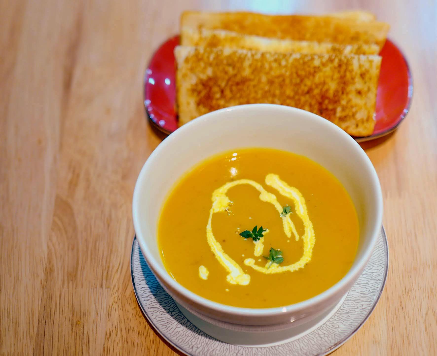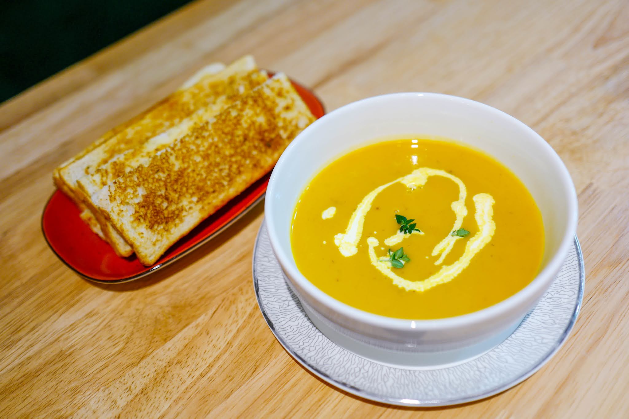 If eggs help you kick off your day on a bright note, bookmark the BT Benedict with Smoked Salmon (RM28), a distinctive recipe compared to the conventional Eggs Benedict. The poached egg is sandwiched in a buttery croissant that's lightly torched to order, till it's extra crisp to the bite - a terrific textural contrast to the luscious egg, which drips into delicious smoked salmon and capers, with house-made chipotle mayo for a spike of spice. On the side, the chef’s choice salad makes for a balanced brunch; ours featured a buoyant medley of fresh rocket leaves, coral lettuce, romaine, pickled onions, croutons and cherry tomatoes in a zesty pomegranate dressing.There's plenty more to satiate the appetite, from the BT Big Breakfast with maple beef bacon to the BT Grilled Cheese sandwich, but if you're looking for something lighter and simpler but still nourishing, try the Pumpkin Soup, naturally sweet, served piping-hot, with a touch of cream and slices of garlic oregano toast on the side (RM12).