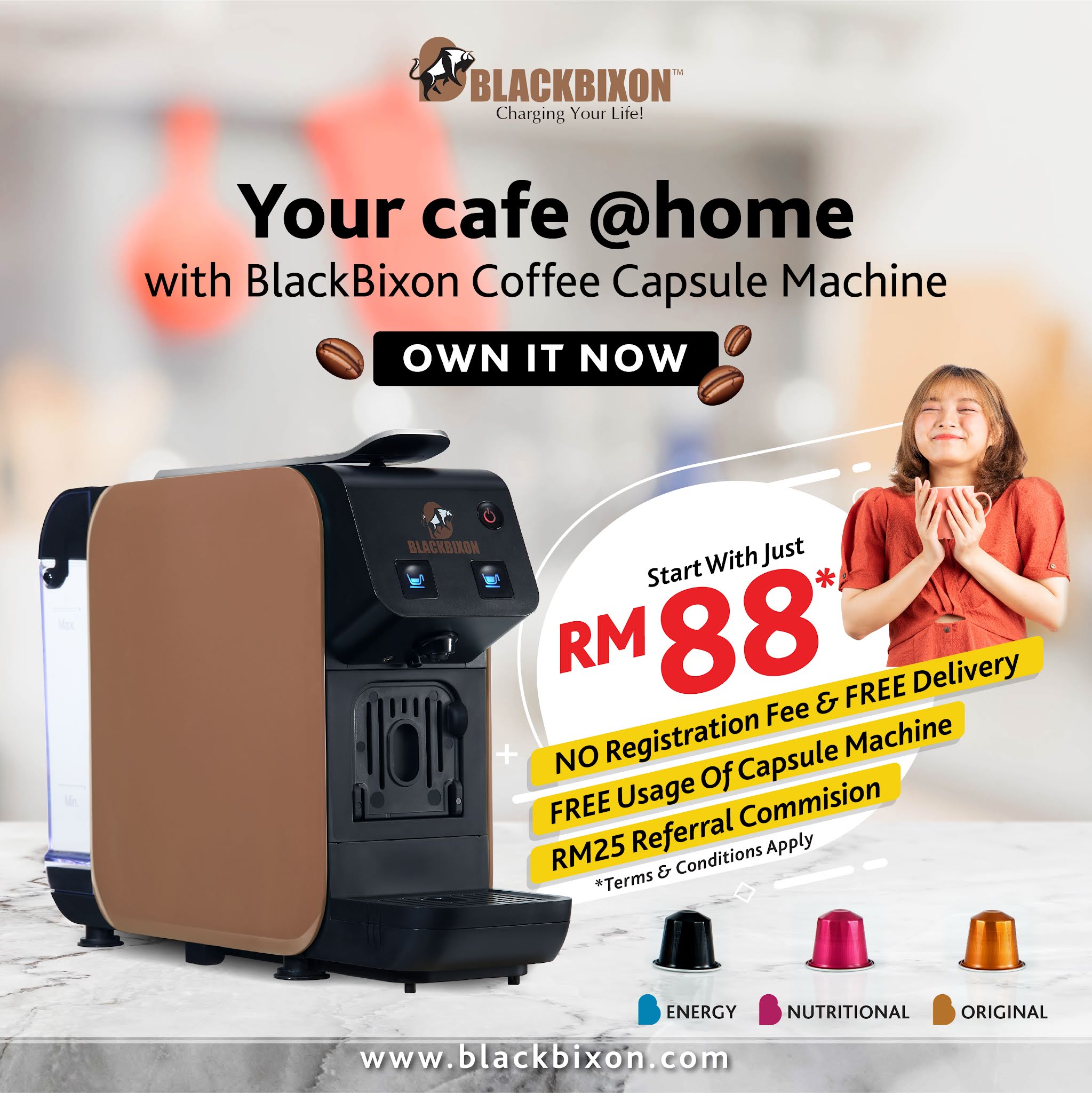 The Consume-To-Own subscription promotion offers you FREE USAGE of the BlackBixon™ Coffee Machine with a minimum subscription of three tubes of coffee capsules per month at RM88, one each of ENERGY Coffee Capsules, NUTRITIONAL Coffee Capsules, and ORIGINAL Coffee Capsules. The initial upfront payment is RM299 (RM218 refundable deposit + RM81 first month subscription fee)
