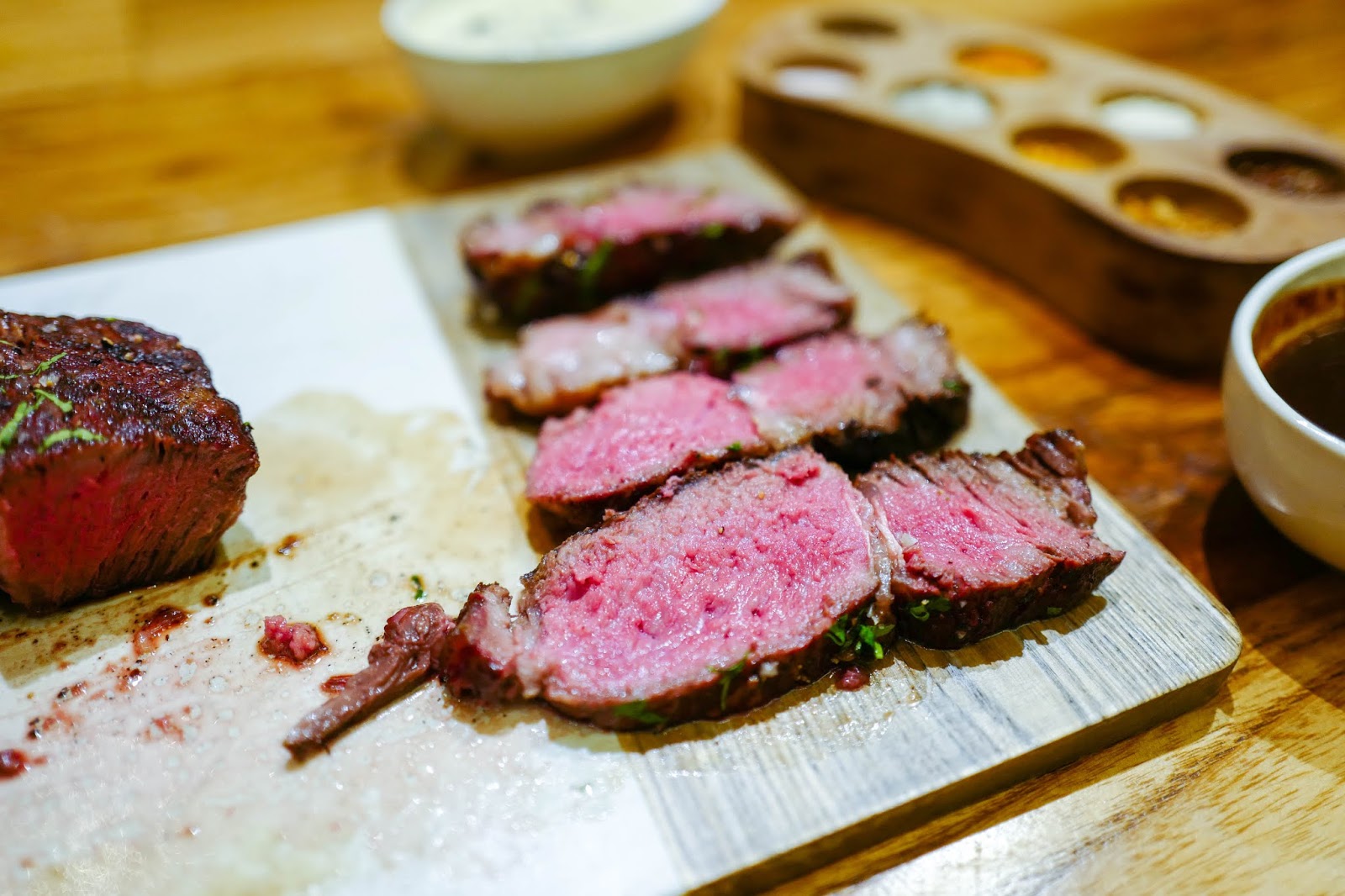 The two sauces comprise Marchand de Vin sauce (a classic red wine reduction laced with shallots and veal stock, accentuating the robustness of the beef) and the Mushroom Cream (a more neutral sauce with a dash of Dijon mustard for punch).
