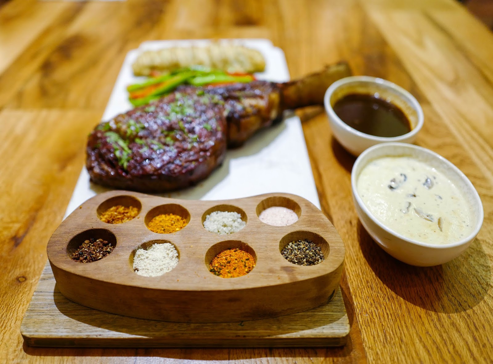 We'd enthusiastically enjoy the tomahawk on its own, but Bo elevates the experience with a series of eight infused salts and peppers, plus two premium sauces, illustrating how seasonings and condiments can brighten or bring even more depth to the beef.