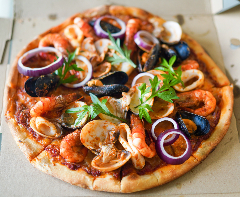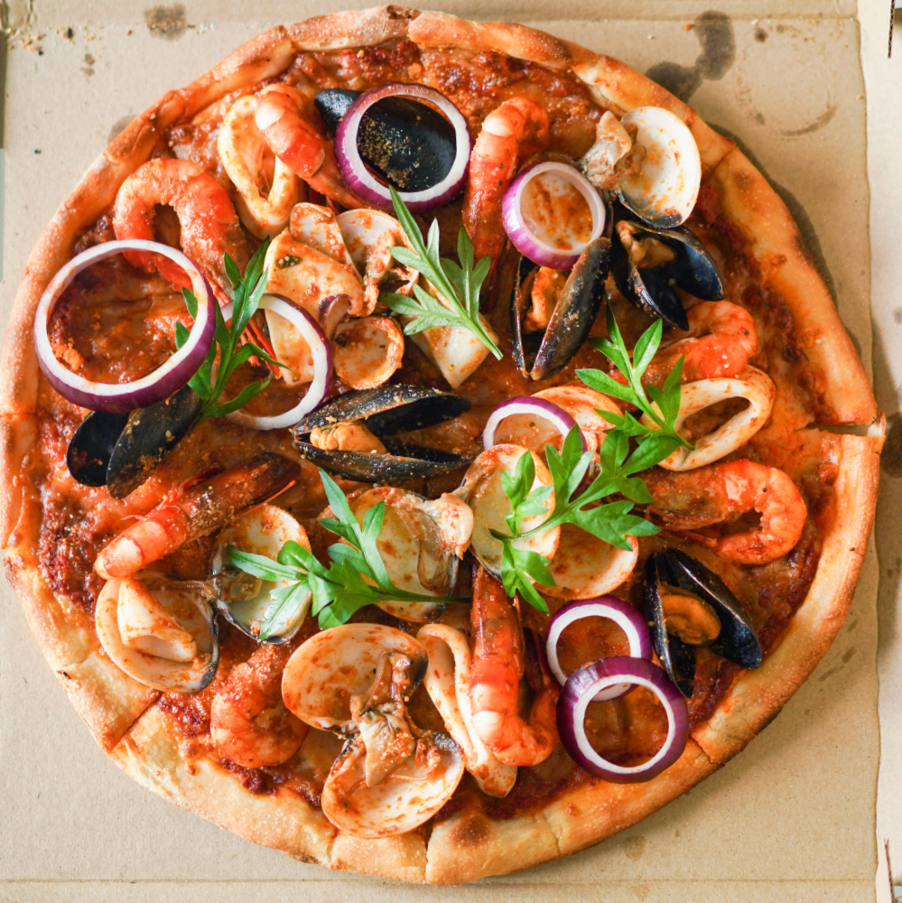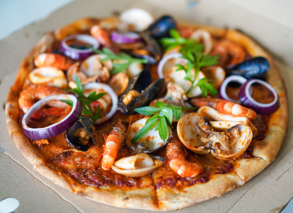 The seafood exceeds expectations, with plenty of whole, fresh prawns instead of tiny, long-frozen shrimp, plus fish, squid, Venus clams and blue baby mussels that blanket nearly the entire pizza.