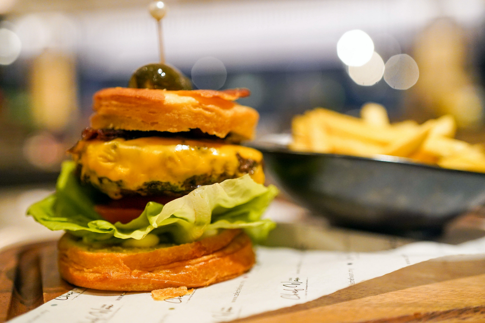 The Homemade Beef Burger boasts a prime Australian beef patty, layered with crispy lettuce, tomato, caramelised onion slices, cheddar cheese and home-cured beef bacon in a cronut bun with side of fat fries.