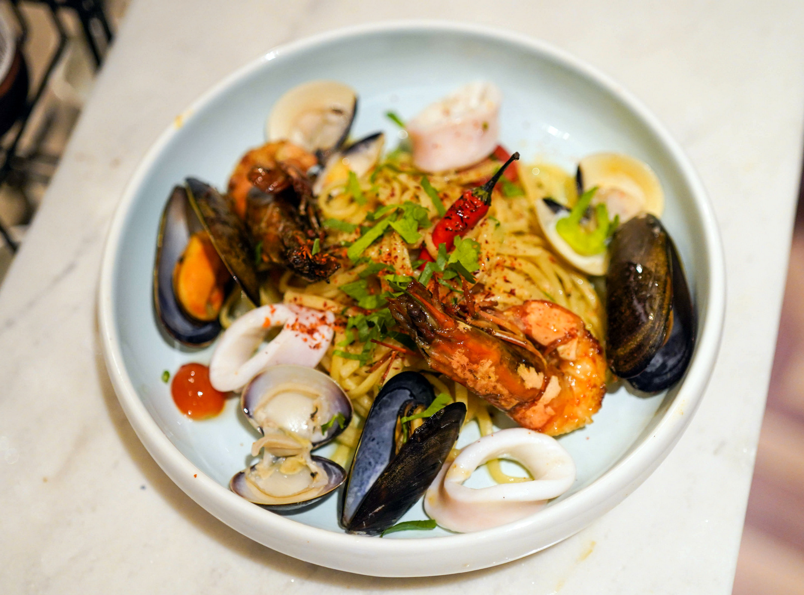 The Seafood Aglio Olio is the seafood pasta lover's choice, with linguine tossed in extra virgin olive oil and garlic, topped with plenty of tiger prawns, squid, Venus white clams and baby blue mussels.
