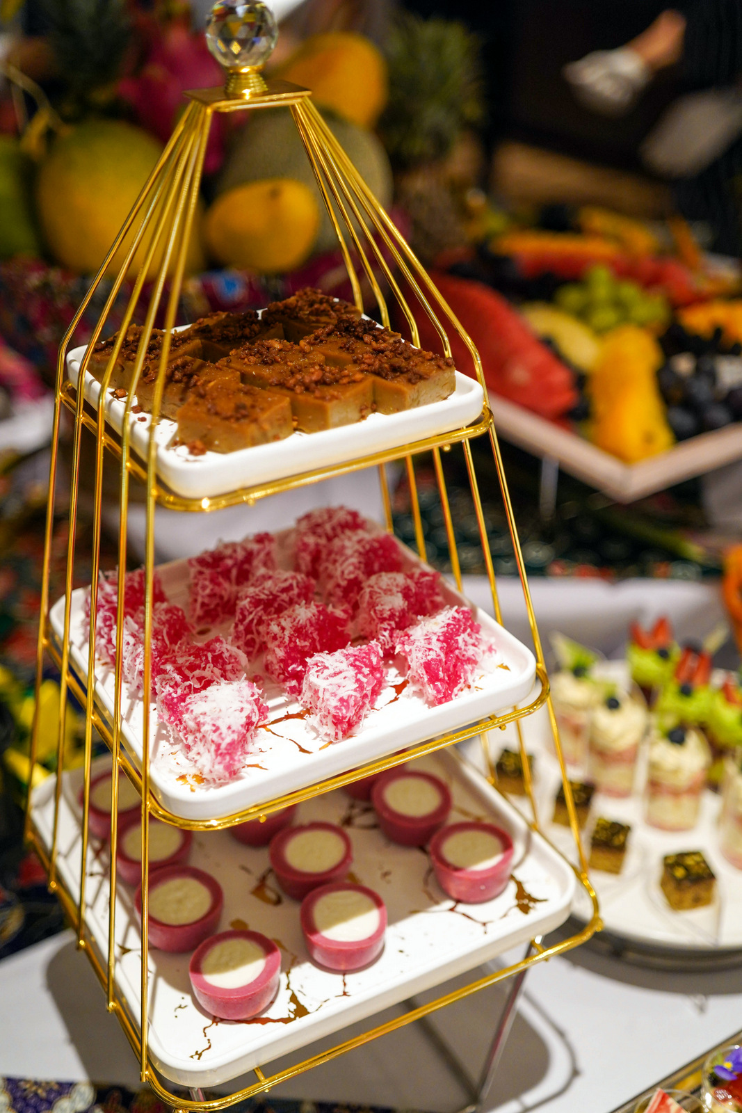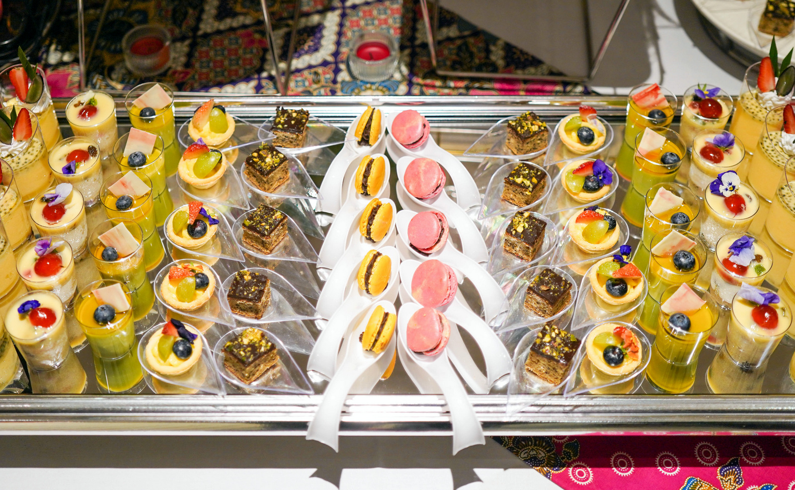 You'll be spoiled for choice with indulgences galore - brownies, strawberry jelly, mango pudding, semolina pudding, pistachio creme, fruit tarts, banana cake, macarons, New York cheesecake, pistachio mousse and white chocolate mousse.