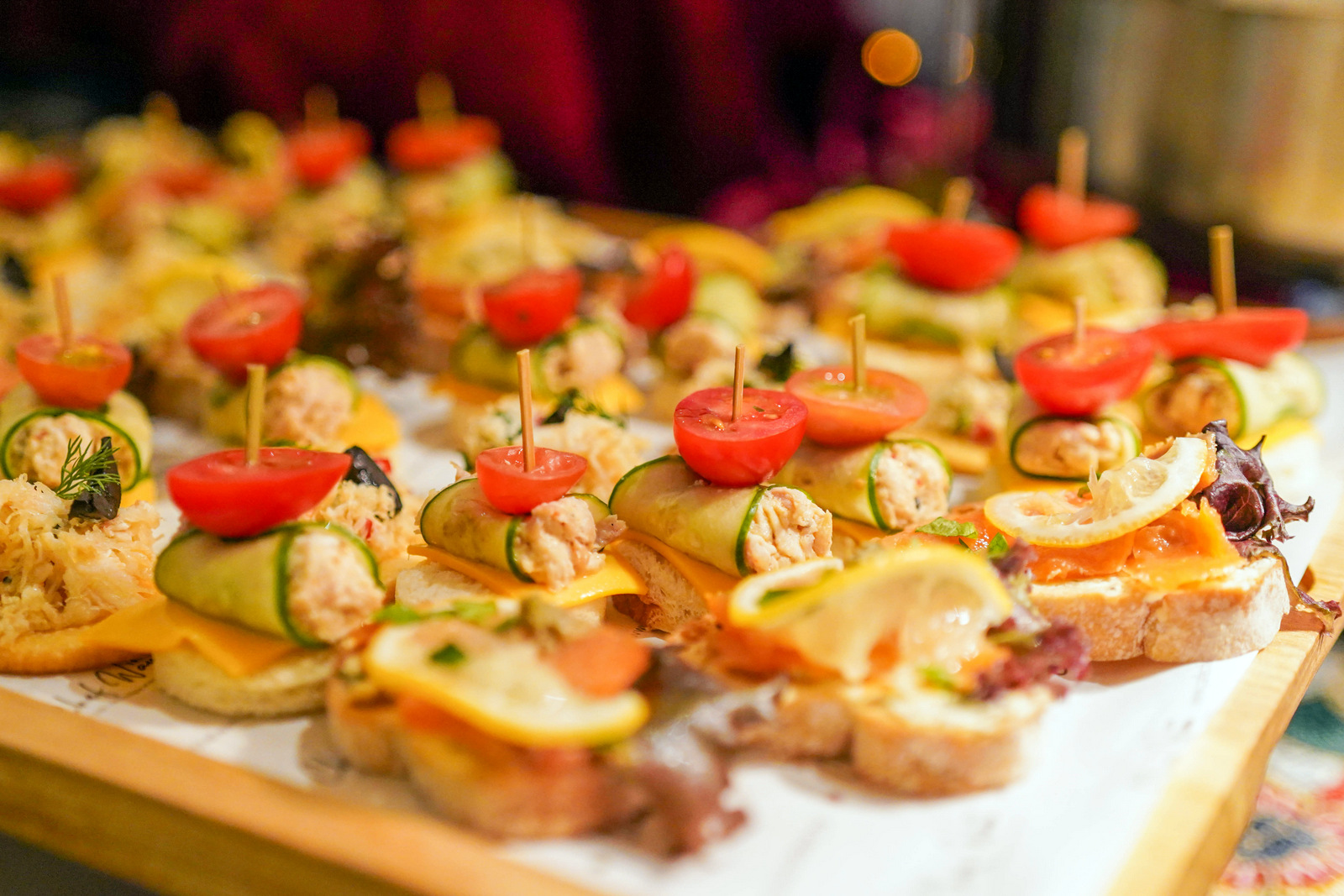 Salmon and tuna canapés complemented chicken wings, beef soup, lamb moussaka and poutine.