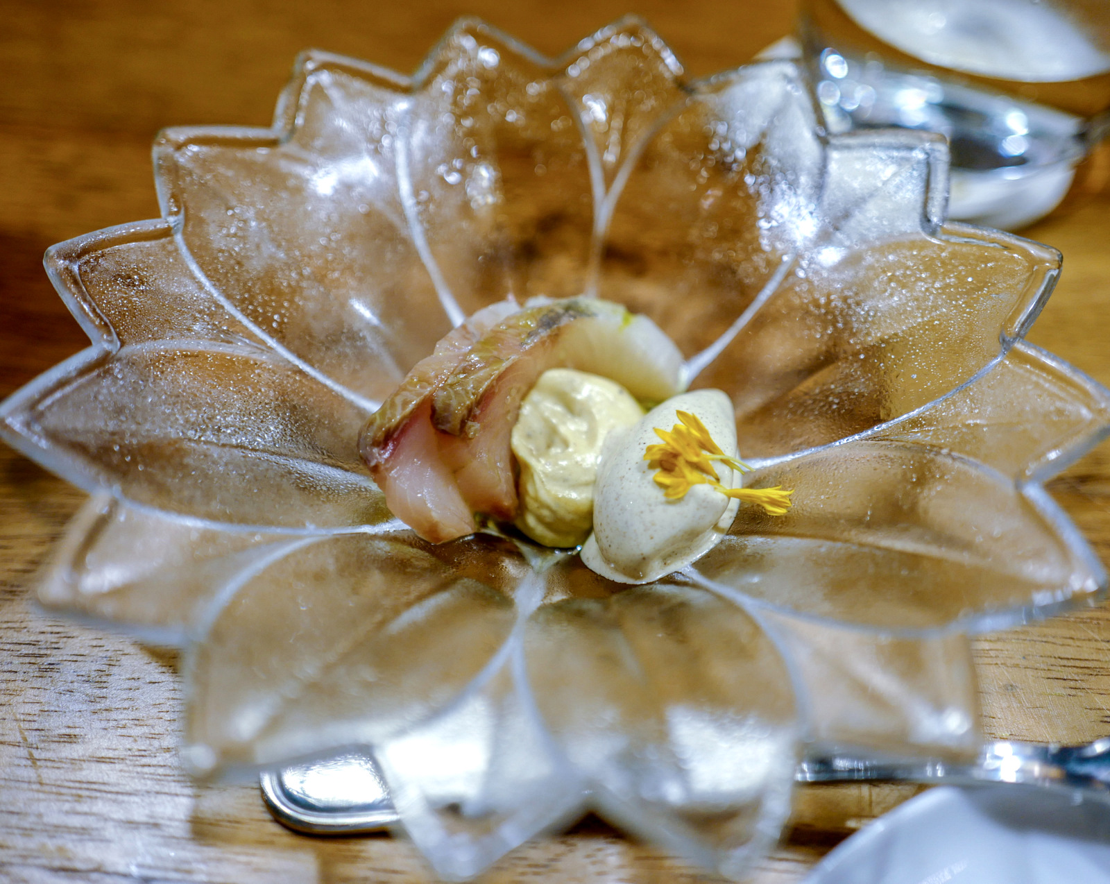 Our favourite courses of this tasting menu emerge early - firm-fleshed hiramasa is aged for a deeper character of flavour, seasoned with kelp oil for a subtle oceanic uplift, richly rounded out by burnt cream and a mustard sorbet that melts into this ensemble for an earthy-tangy fattiness - an unorthodox but revelatory approach to yellowtail kingfish, proving that there are still plot twists to savour in the secrets of sashimi.