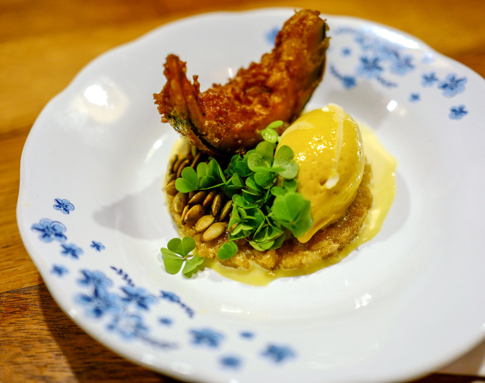That inspiration is woven into the dessert of classic glutinous rice laced with palm sugar, brightened with a whipped sabayon of coconut and desiccated fresh coconut, crowned with three textures of pumpkin - roasted pumpkin seeds, a tempura of pumpkin, and an ice cream of pumpkin that represents Bali's reviving island breeze. A terrific, thoughtfully executed finish.