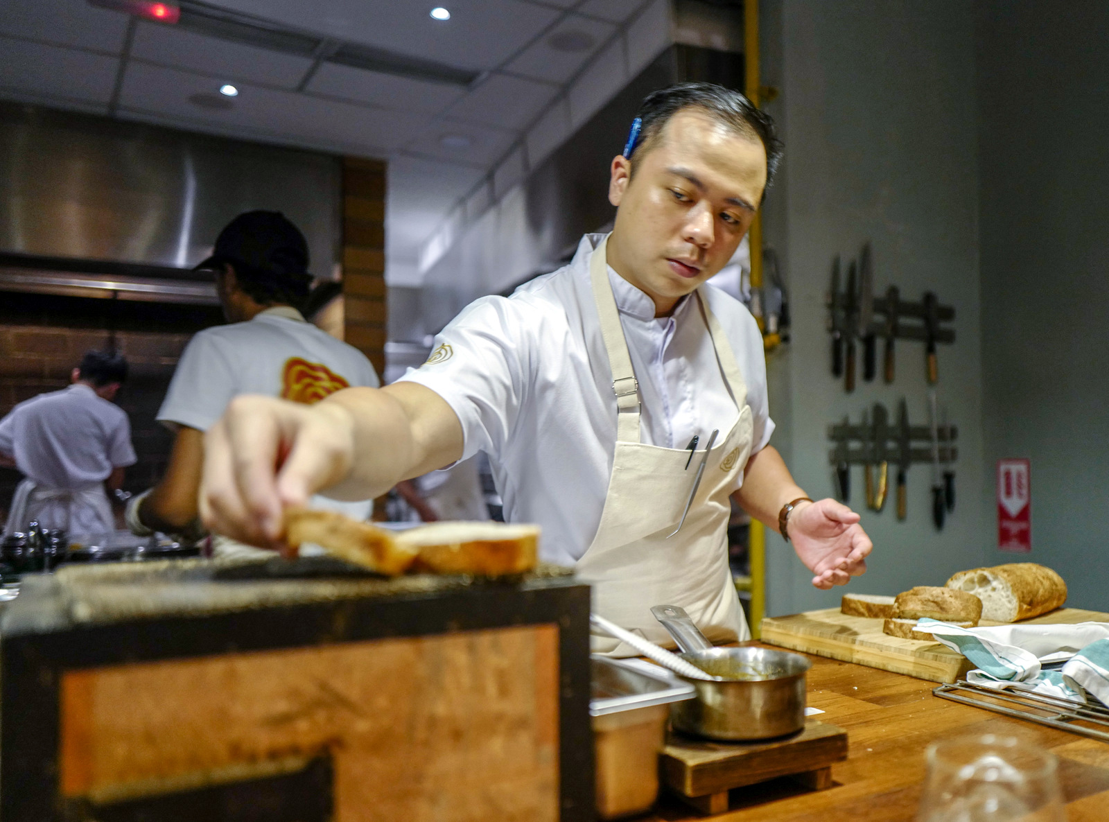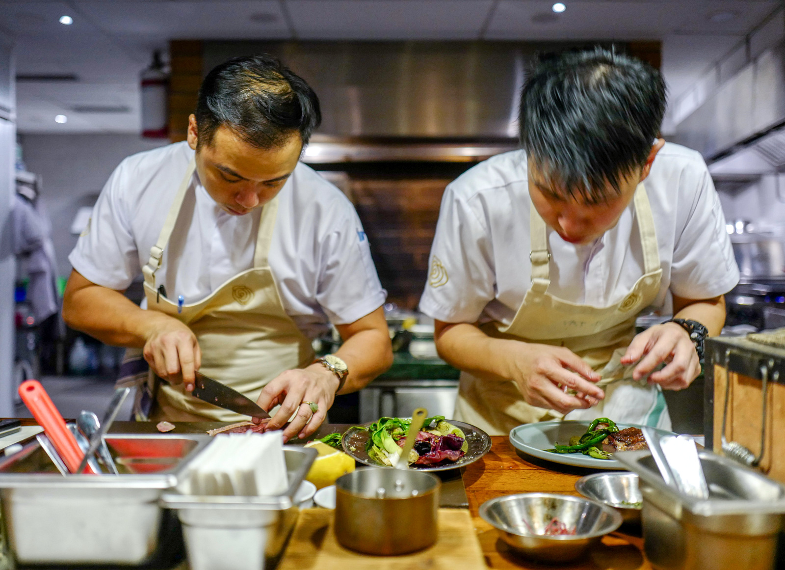Seated at the chef's table facing Jing Ze's open kitchen, we peer up from our plates to see the restaurant's founding chef Nicholas Scorpion slicing through a tomahawk steak, scarcely three feet in front of us. On Scorpion's left, his right-hand man David Tay puts the final flourishes on a duck dish that'll soon be dispatched to delighted diners. Beside and behind them, it takes a village to run this kitchen, with other brigade members busy torching, roasting, boiling, baking and braising.