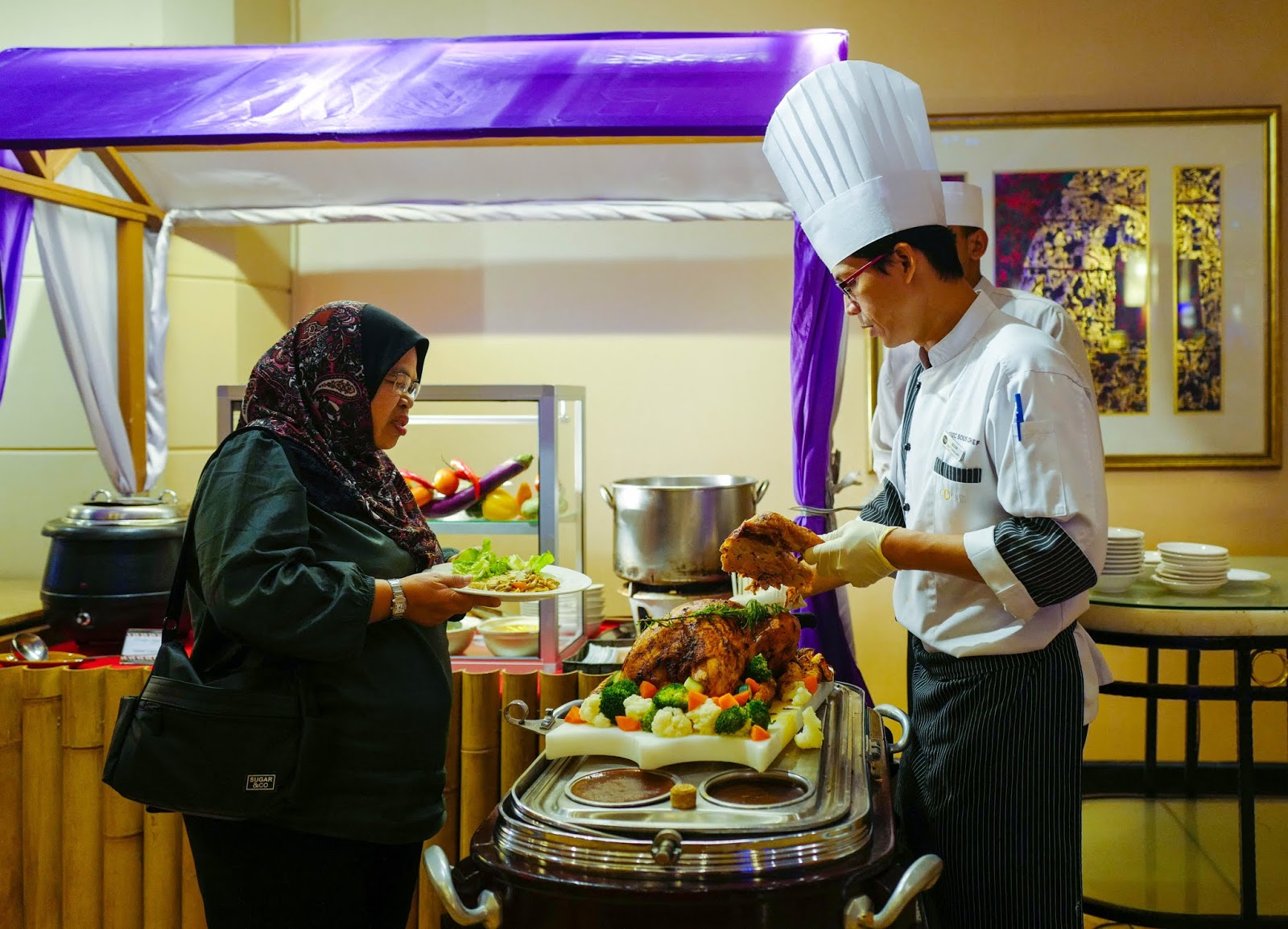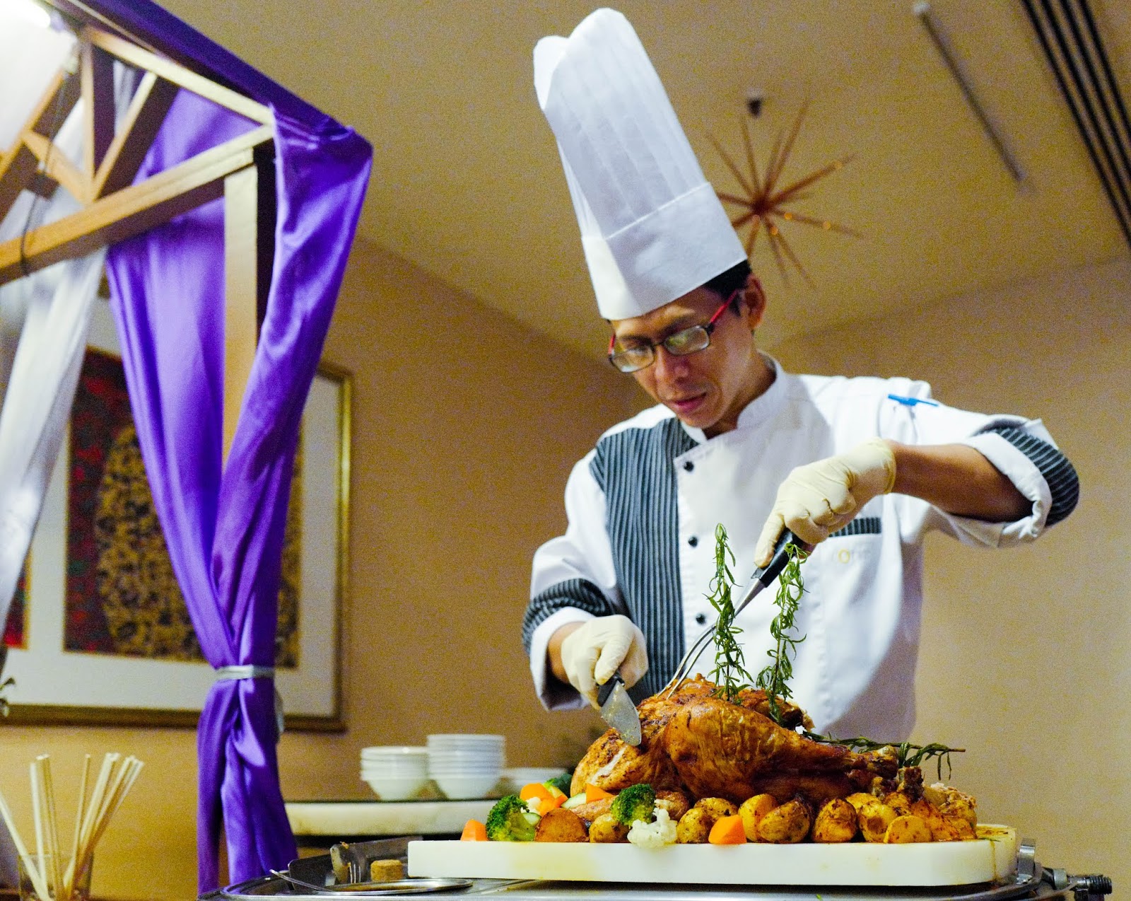 Dondang Sayang's chef Nizam brings nearly three decades of professional experience to the plate, spearheading an expanded Christmas Eve dinner buffet of some 90 specialities. The traditional, tenderly roasted turkey is this season's can't-miss pleasure, packed with a chestnut stuffing infused with fresh herbs, apples, carrots and celery, paired with cranberry and giblet sauces.