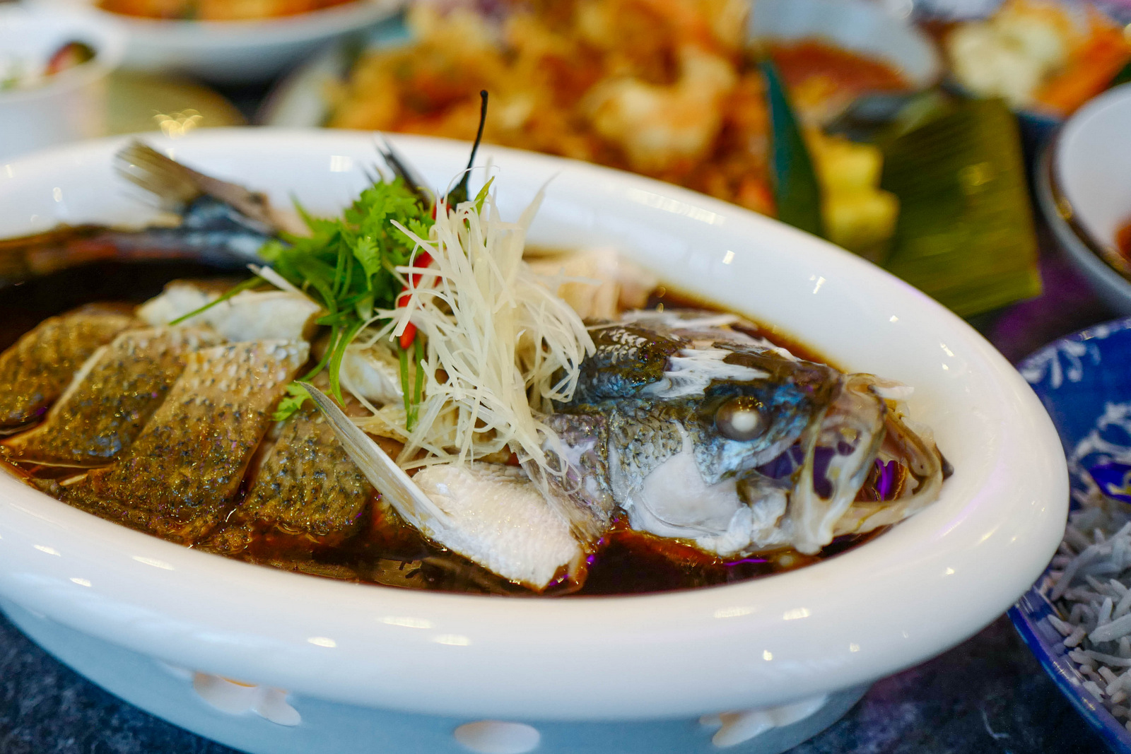 The main courses are all marvellous, so it's difficult to choose a favourite. If you like fish, the sea bass with superior sauce is a delicately delicious representative of Chinese steamed cooking; for fans of robust recipes, the daging rusa rendang is a punchy pleasure that would be fit for the most lavish Malay kenduri; if the spice road is up your alley, the udang kari masala should captivate your senses with an aromatic Indian medley of flavours.