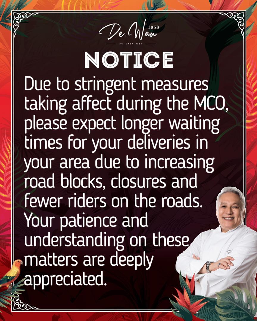 Chef Wan’s classic and contemporary creations can now be enjoyed at home, with delivery and takeaway services throughout the MCO period. Enjoy a 20 percent discount off the delights from De.Wan 1958 by Chef Wan; order between 11:30am-6:30pm through the website, dewan.space