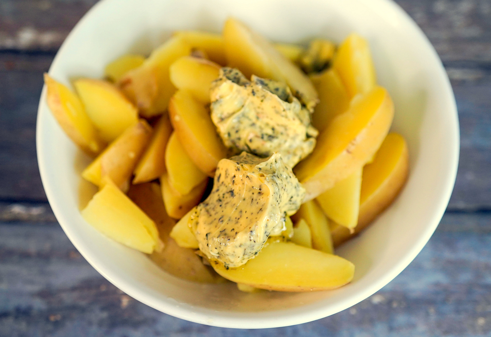1. Heat up some water, then add salt. When it’s boiling, add potato wedges. Cook until about 70% done - noticeably soft but not mashed-potatoes mushy.