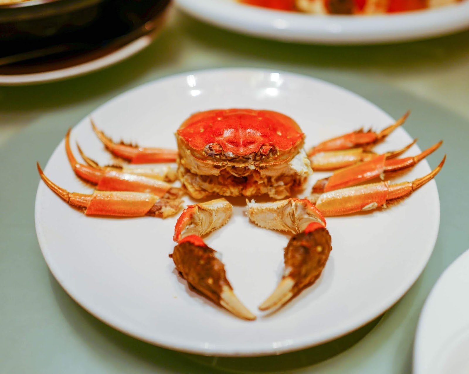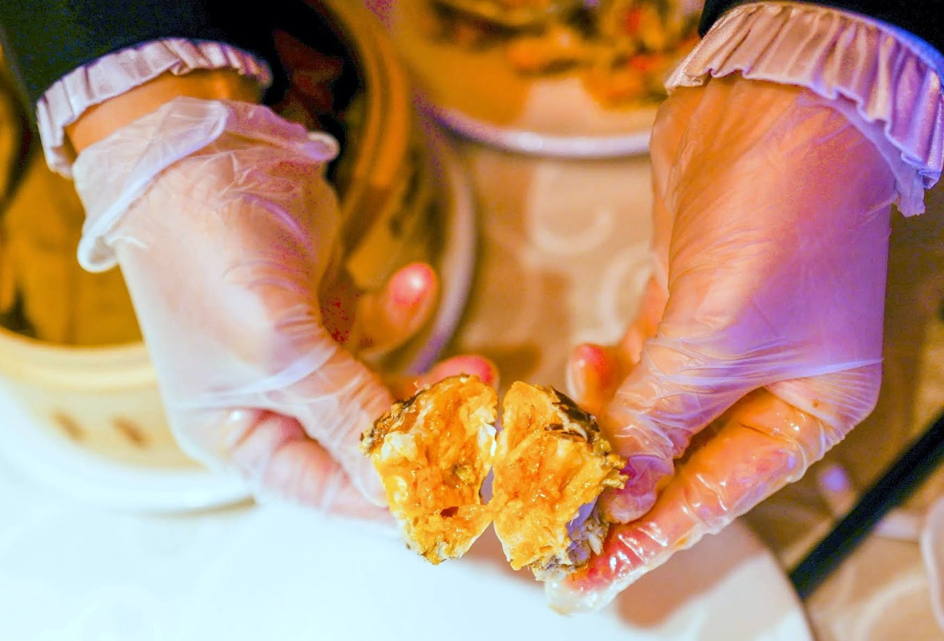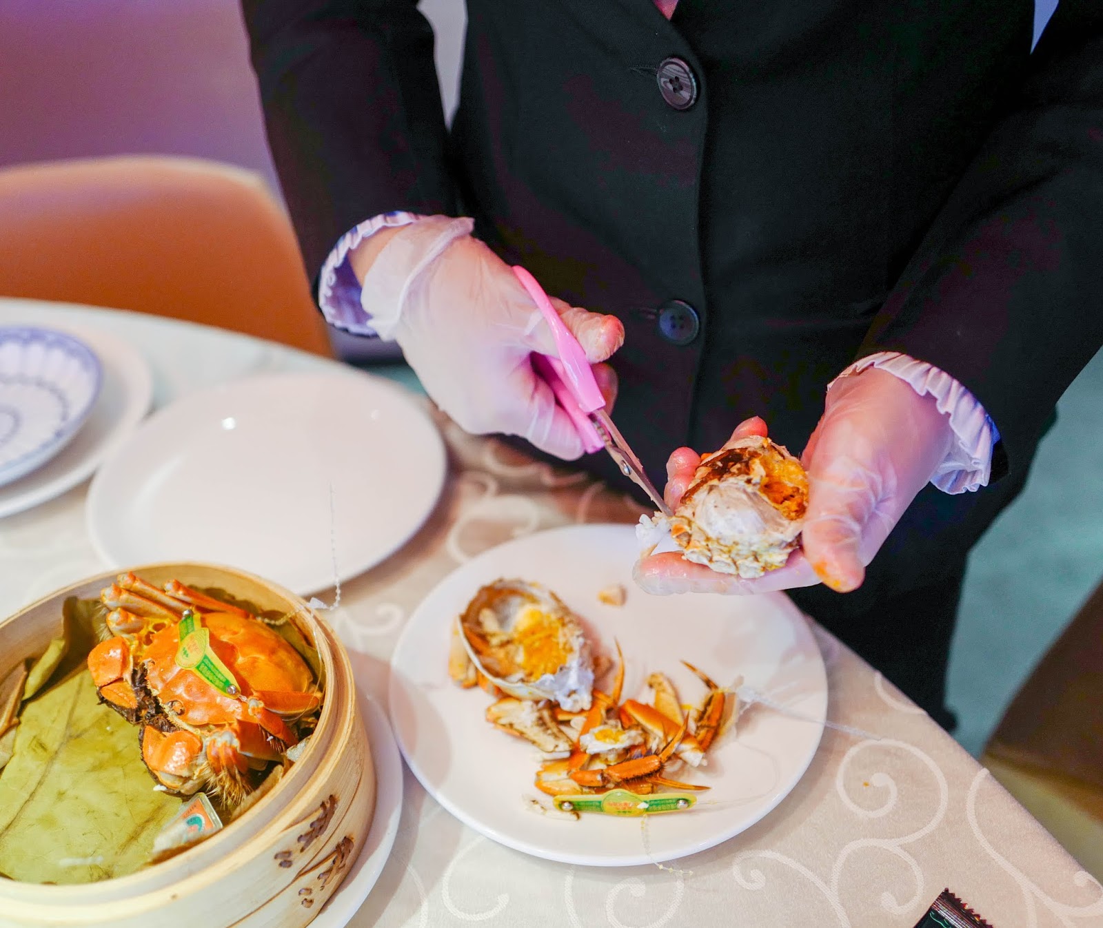 The main event comes soon enough: Each customer receives one hairy crab, weighing approximately 180 grams, steamed whole in lotus leaves to preserve its purity of flavour and luscious texture, served simply with vinegar and ginger. The art of preparing the crabs for consumption is on full display at the table, with the shell, legs and claws methodically detached, ensuring you'll enjoy every precious morsel of the flesh and especially the savoury, bright-orange roe, bursting with buttery creaminess, sultry and sensuous like no other.