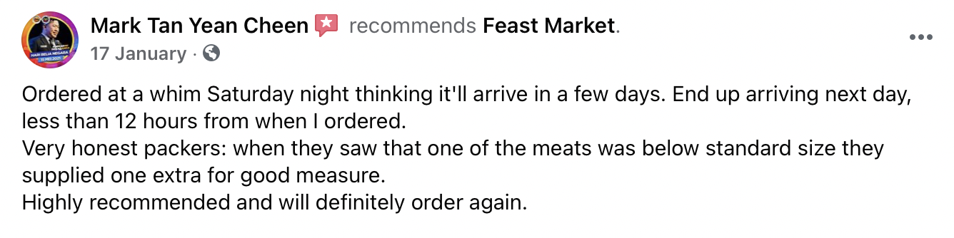 Feast Market has enjoyed consistently glowing reviews from its customers over the past several months - check out a sampling of their feedback here, praising the platform's portions, prices, quality and customer service.
