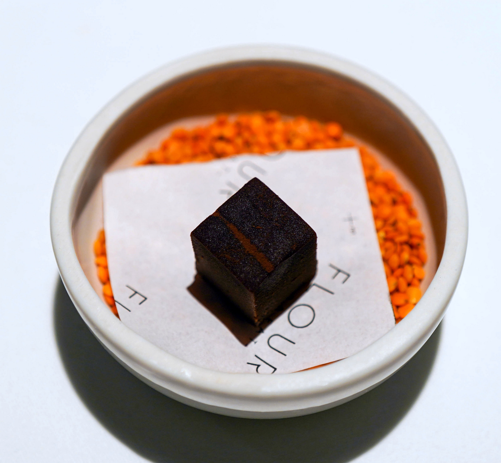 Beside it, a small piece of meringue looks pure and innocent - but like all things FLOUR, the surface conceals surprising complexities. The candy's sweetness swiftly yields to savoury undercurrents of tomato chutney with Himalayan salt, ending in the lingering warmth of chillies with dried mint. A rush of sensations in a single bite, true to India's summer tradition of tempering spice with sugariness to head off the heat.