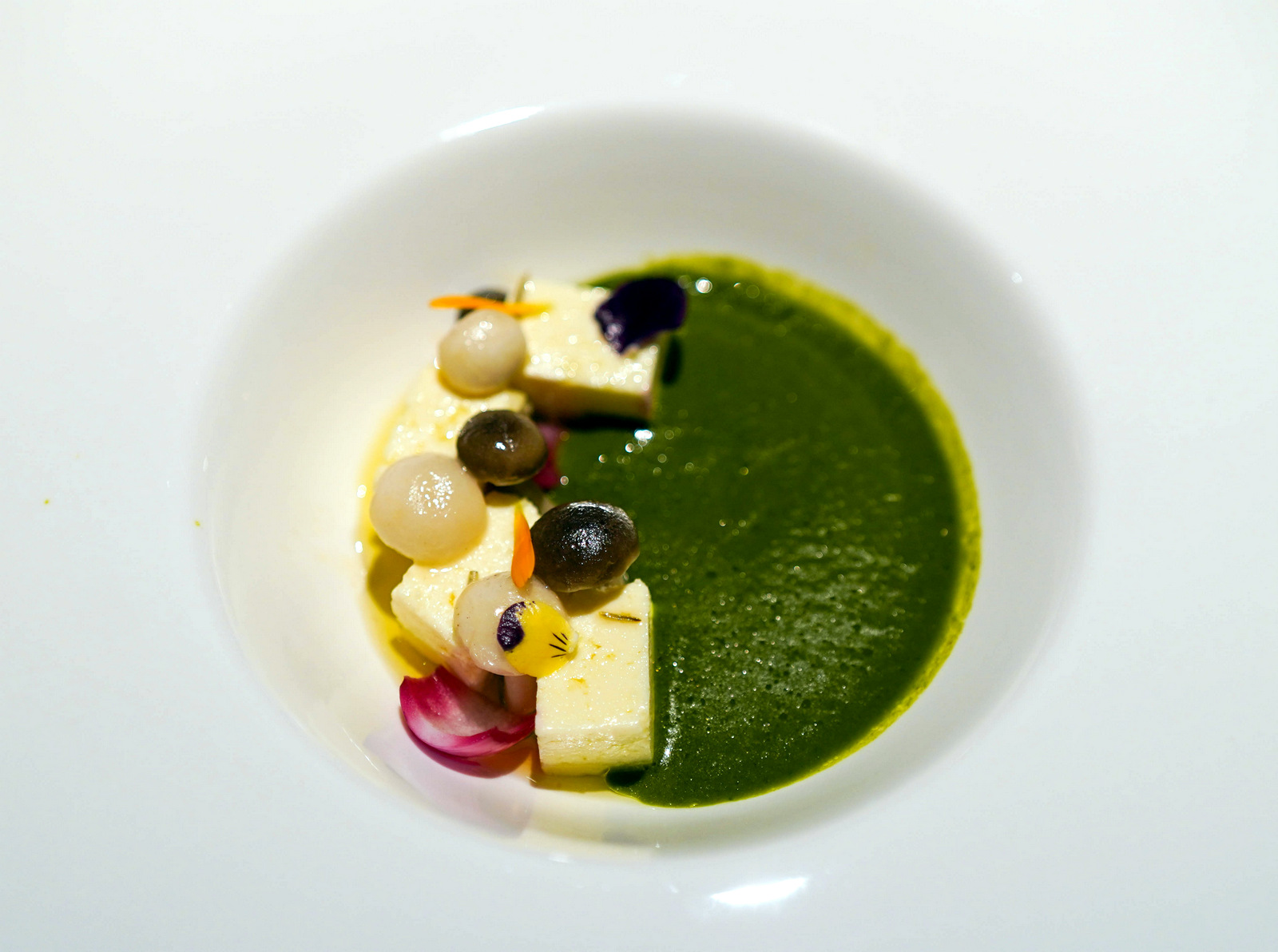 Also reviving is the tart of capsicum and cucumber, looking like tropical passion fruit but tasting like the luscious puree of a mild bell pepper, uplifting with a buoyant balance of powdered spices that accentuate the sense of summer's vibrant colours and flavours.
