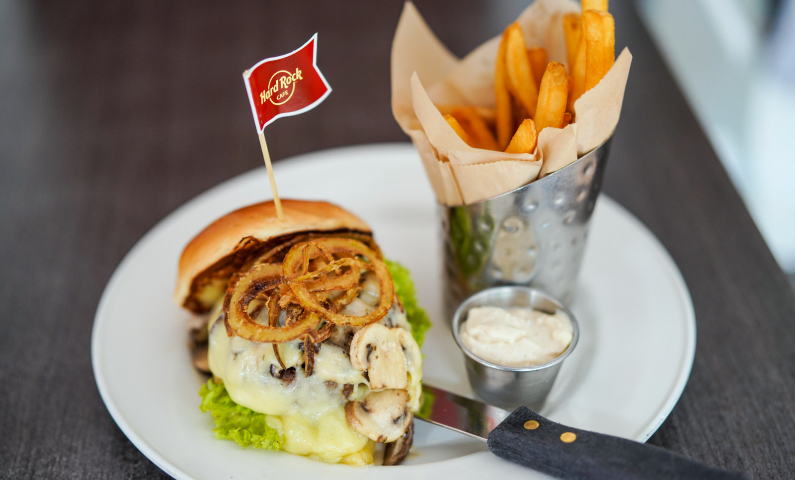 If you prefer earthier flavours and creamier textures, choose the Mushroom Swiss Burger, which layers the Black Angus patty with roasted mushrooms, Swiss cheese, shoestring onions and leafy lettuce. This comes with more of the addictive fries and a garlicky aioli to keep you munching eagerly - it's clear why Hard Rock Cafe has millions of fans of its burgers across the globe.