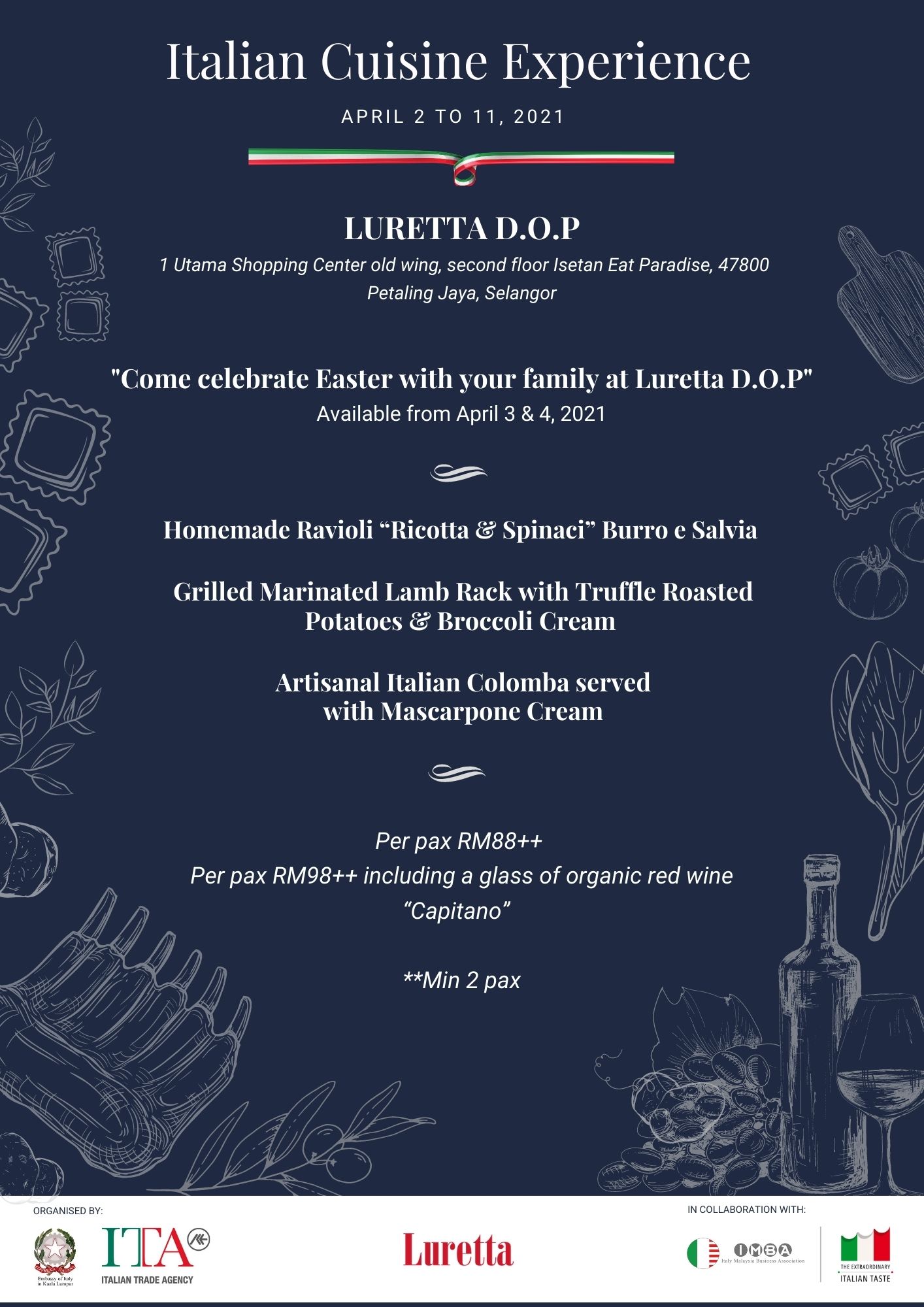 Buon appetito! In conjunction with the joyous Easter Holidays, the Italian Trade Agency (ITA) alongside the Italian Embassy in Kuala Lumpur have joined hands with the Italy-Malaysia Business Association (IMBA) to launch the first edition of ‘Italian Cuisine Experience 2021’.