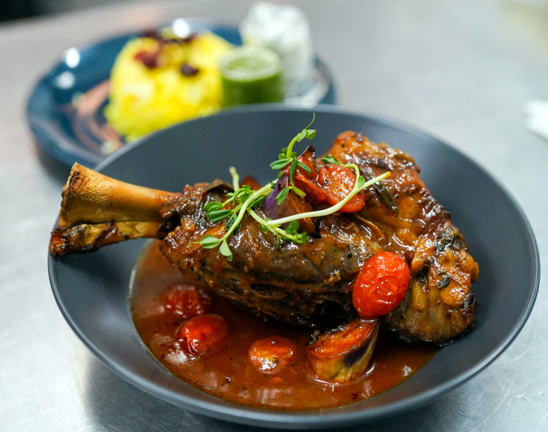 The lamb is paired with aromatic saffron rice studded with jewels of dried cranberries and pistachios, rounded out with the yogurt tang of cucumber raita and the sambal hijau-like spiciness of green chilli harissa. If you love multi-layered flavours and textures on your plate, order this lamb for your next dinner.