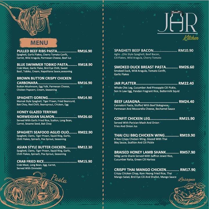 With 16 hearty, heartwarming dishes, JAR Kitchen promises a feast of fun recipes with Asian and Mediterranean inspirations. Chef Nik Zaim has honed his craft at respected restaurants and hotels for 13 years, so he knows what makes customers happy - from honey-braised lamb shank to mango chicken and teriyaki salmon, confit chicken leg to crab fried rice, pulled beef rib pasta to spaghetti goreng, JAR is a joy for fans of delicious deliveries.