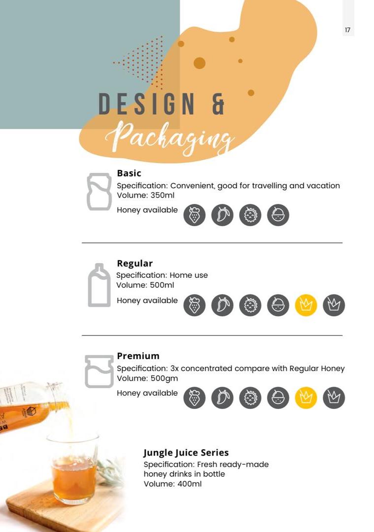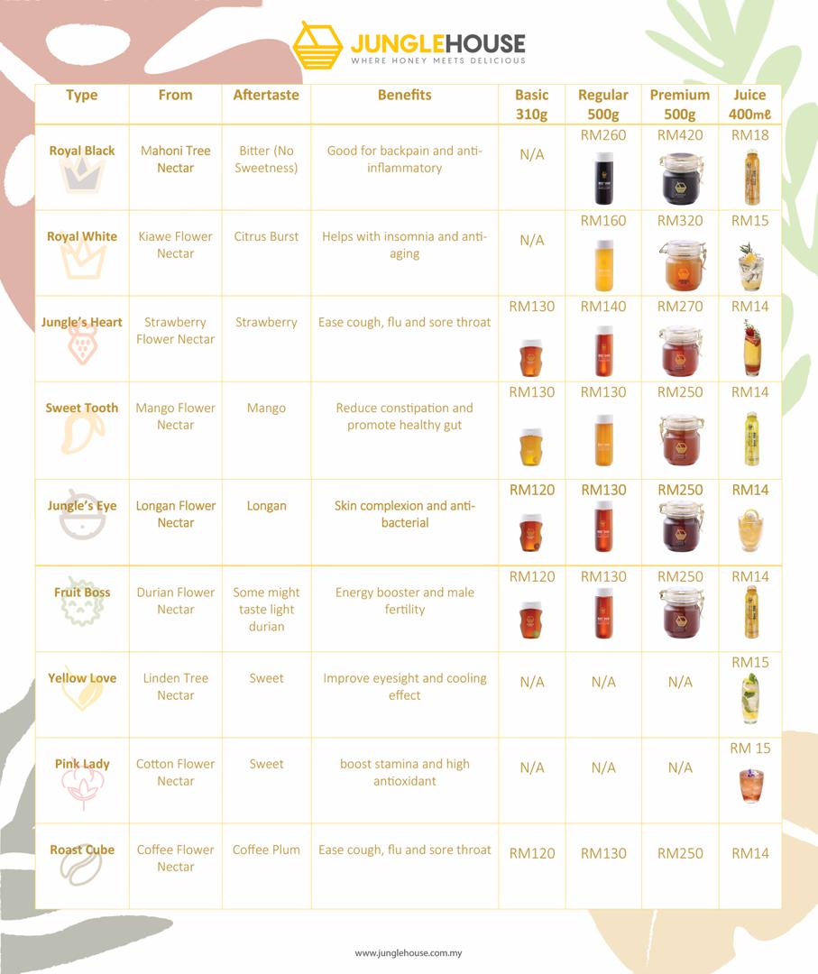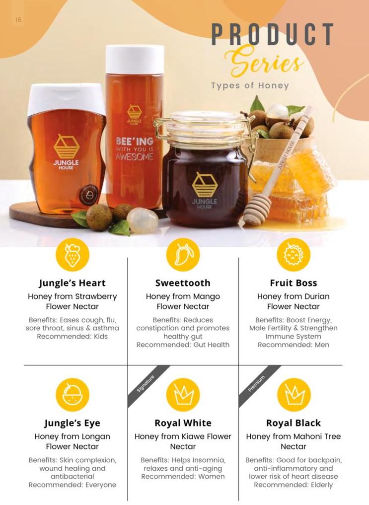 All in all, Jungle House's main product series comprises nine types of honey - other possibilities include coffee flower nectar (also to ease the flu, coughs and sore throat), cotton flower nectar (a high-antioxidant powerhouse for stamina), linden tree nectar (for eyesight), longan flower nectar (anti-bacterial, for skin complexion) and mango flower nectar (promoting a healthy gut). Products are generally available as a Basic (starting at RM96 for 350ml), Regular (starting at RM104 for 500ml), Premium (starting at RM200 for 500ml, with three times the concentration), or in Juice form (see chart above for details).