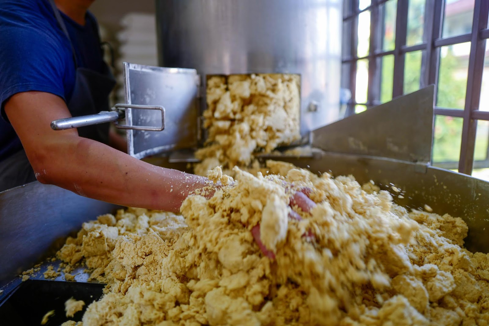 After about 10 minutes of mixing, the team starts feeling the results by hand, massaging the mixture and testing for firmness and springiness. Minor daily fluctuations in temperature and humidity can affect the texture of the mix, so more flour is introduced if necessary.