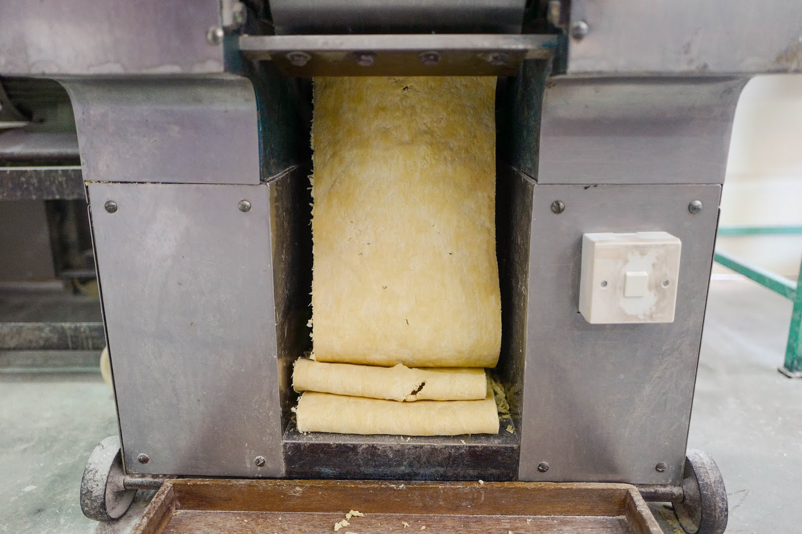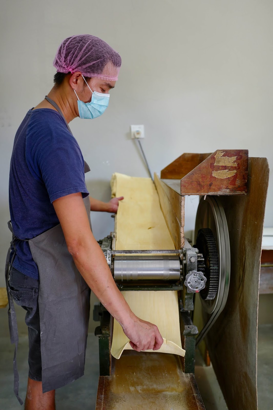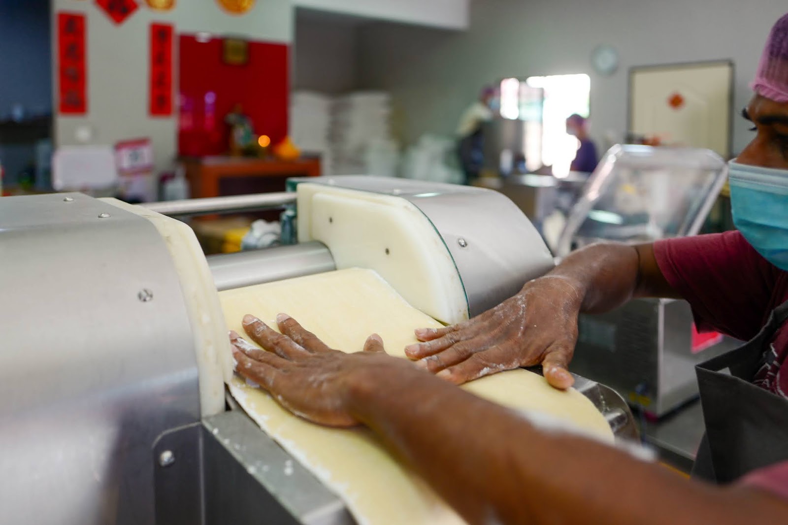 Once the team is satisfied, the noodle sheets begin to take shape in flattening machines. The sheets go through four such machines, making them progressively thinner for the precise coveted texture. In the final machine, the sheets are run through a corn starch sprinkler to keep them from sticking together.