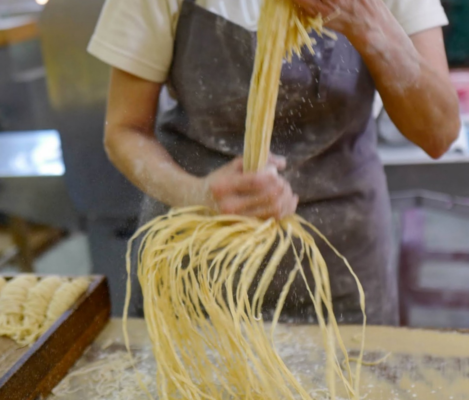 The older cutting machine has been a stalwart for 30 years, a more manual affair that results in thicker noodles. The team works like clockwork, ripping the strands apart by hand to accurately and efficiently portion out 80 grams of noodles every five seconds or so.