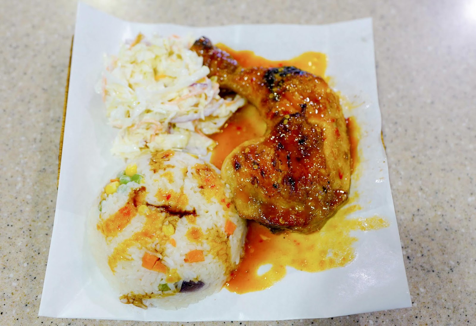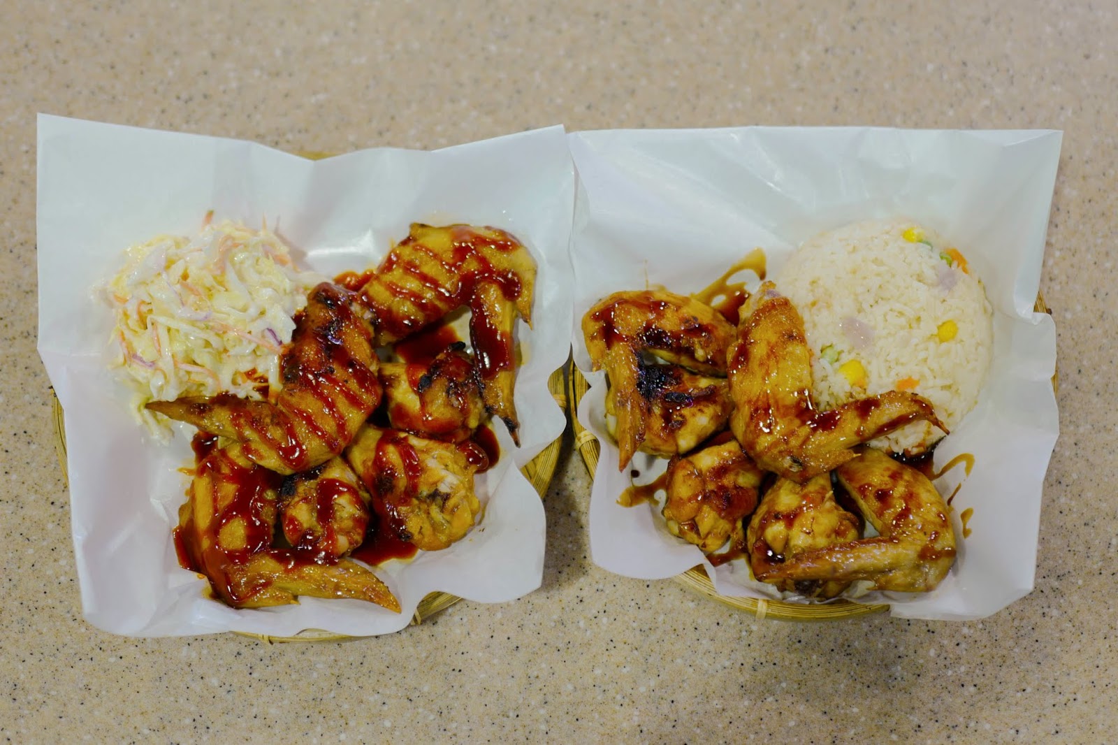 Hot Wing's Single Combo comes with six pieces of chicken wings in one of seven sauces and one of four sides of your choice (RM14). Pictured is the Single Combo with wings in BBQ sauce and coleslaw, and another set of wings with honey glaze sauce and rice.