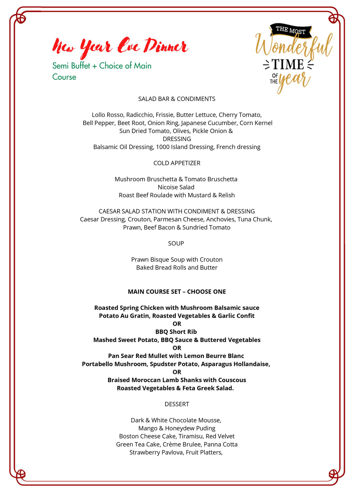 Keep the merriment going till New Year's Eve, with another semi-buffet and choice of main course, similarly priced at RM138 nett per adult and RM69 per child, with a fresh selection of temptations for the final day of 2020. Usher in 2021 with an all-you-can-eat selection of starters, salads, soup and desserts, with a choice of main course such as roasted spring chicken, BBQ short ribs, pan-seared red mullet or braised lamb shank.