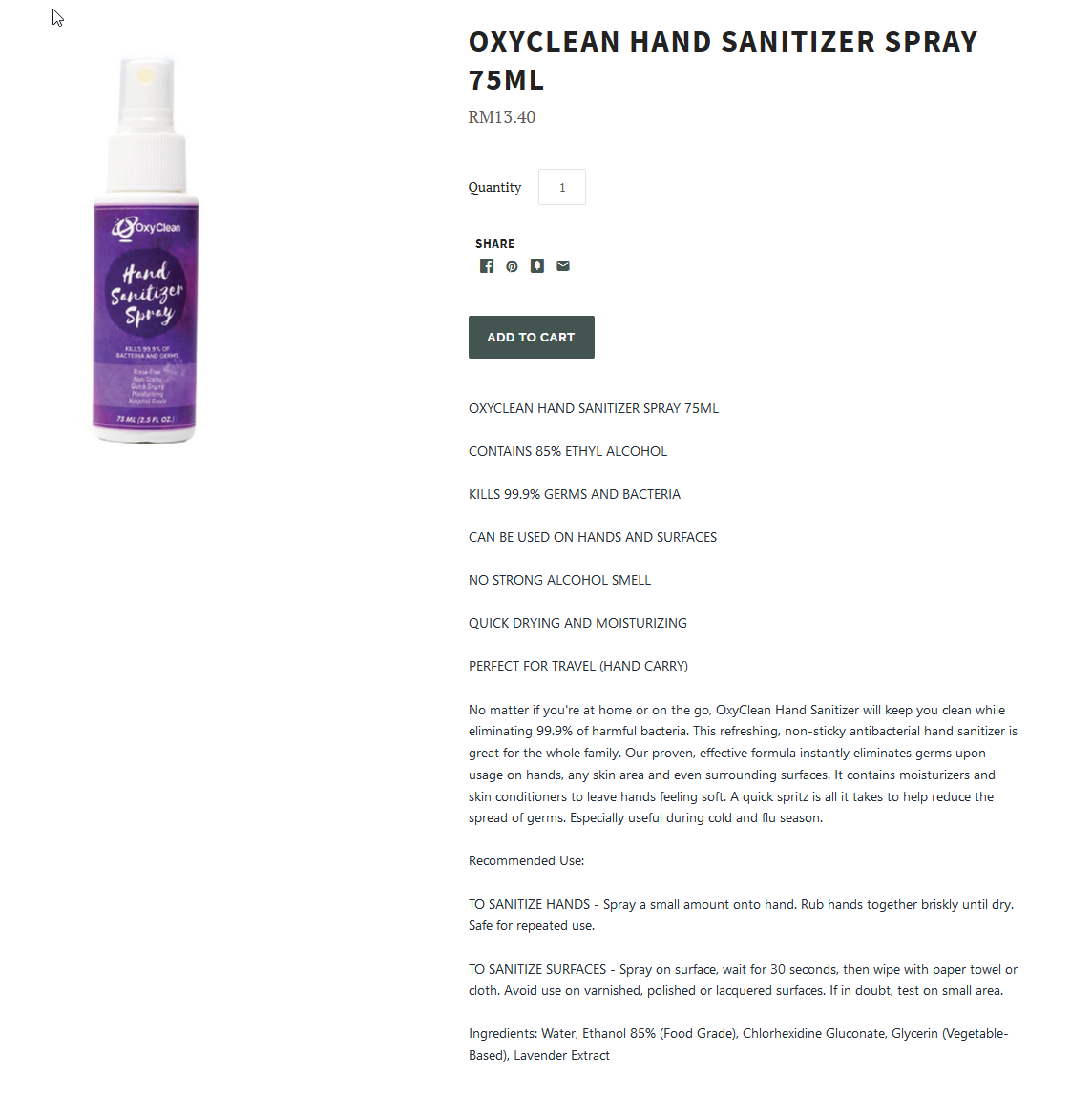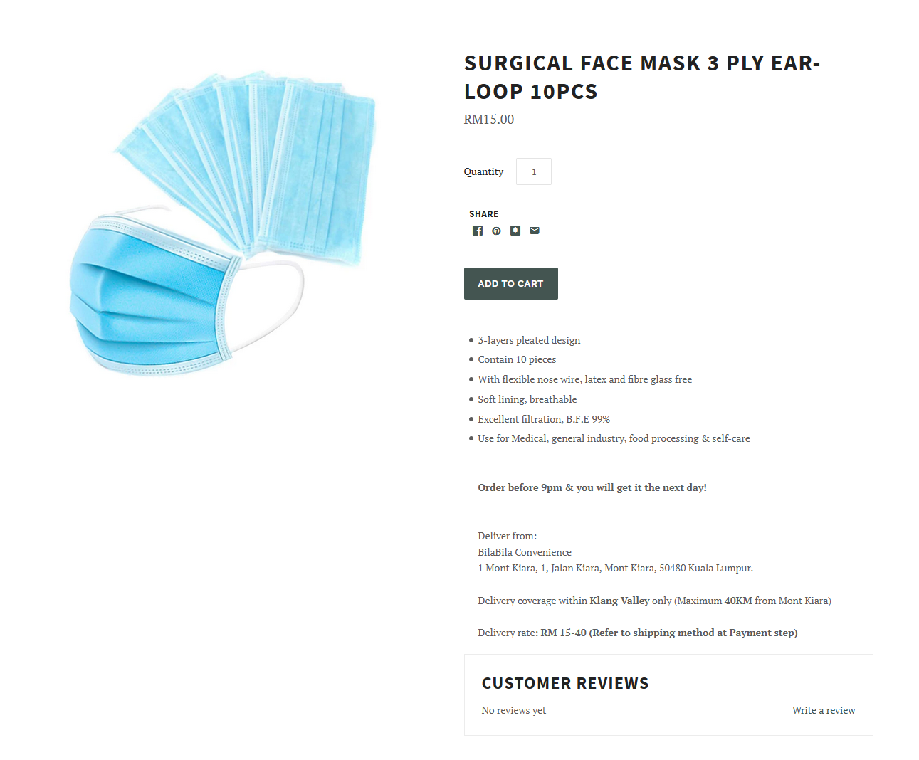 Surgical face masks and hand sanitisers are also currently in stock - the masks are available in sets of 10 pieces for RM15. Delivery fees also start at RM15.