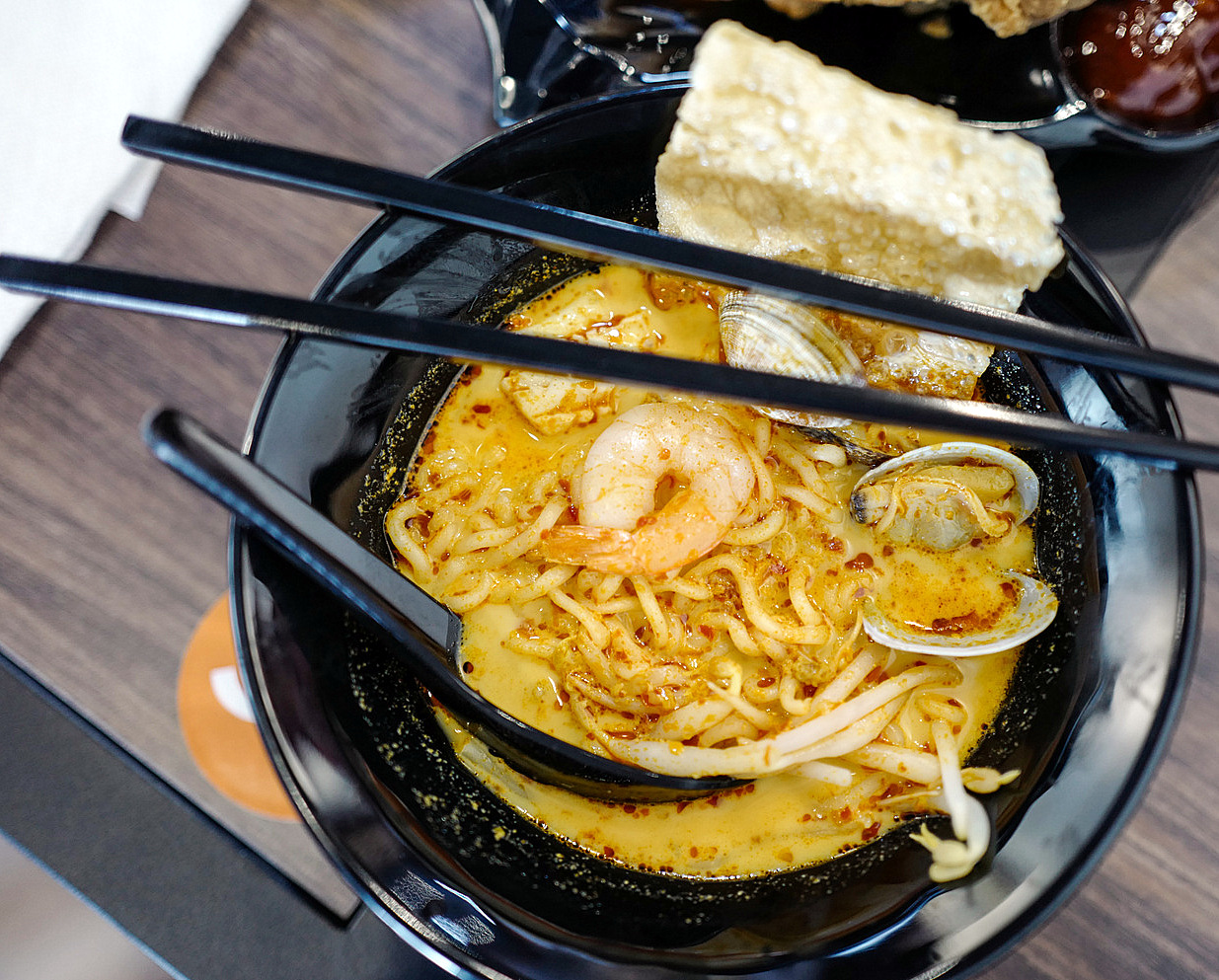 Noodles all day, everyday: OMB (One More Bowl) is an interesting destination for fans of soupy goodness, offering a new concept that enables patrons to enjoy two different bowls of noodles for the price of one. The diverse selection is made for slurping - choose from Italian spaghetti, Korean ramen, Japanese udon, Chinese egg noodles & more, combined with choices of broth that are intended to evoke Malaysian home cooking, including pork bone soup with abalone, pepper soup with pork belly, seafood in curry, & many others. Customers can order two basic bowls comprising two different flavours for RM12.90 or RM17.90, depending on the ingredients; there are also options for two premium bowls of two flavours featuring abalone & other ingredients for a total of RM29.90. Flavours are mellow. clean & clear; if you're extra-hungry, it's worth adding on a piece of crunchy-fried chicken, chunky, tender & well-seasoned (RM5.50).