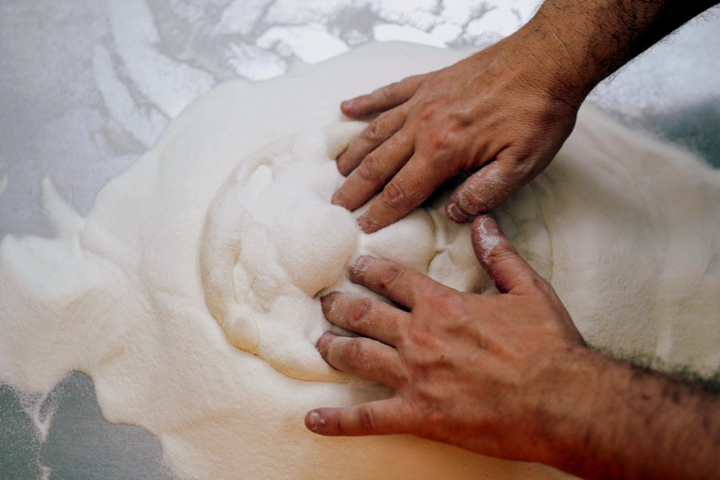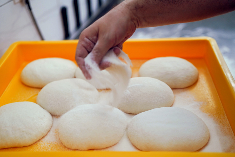 Pizza Roma ages this proprietary flour blend for at least two days, resulting in a richer profile. Once the orders come in, each dough ball is hand-pressed into the elongated shape of the pizza, stretched with the fingers from centre to side, true to the Latin word 'pinsere.'