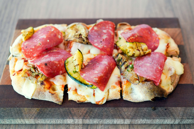 Meat lovers will savour the Salchichon, draped with tender slices of salchichon-style turkey sausage, marinated zucchini, eggplant and mozzarella over a robust tomato sauce.