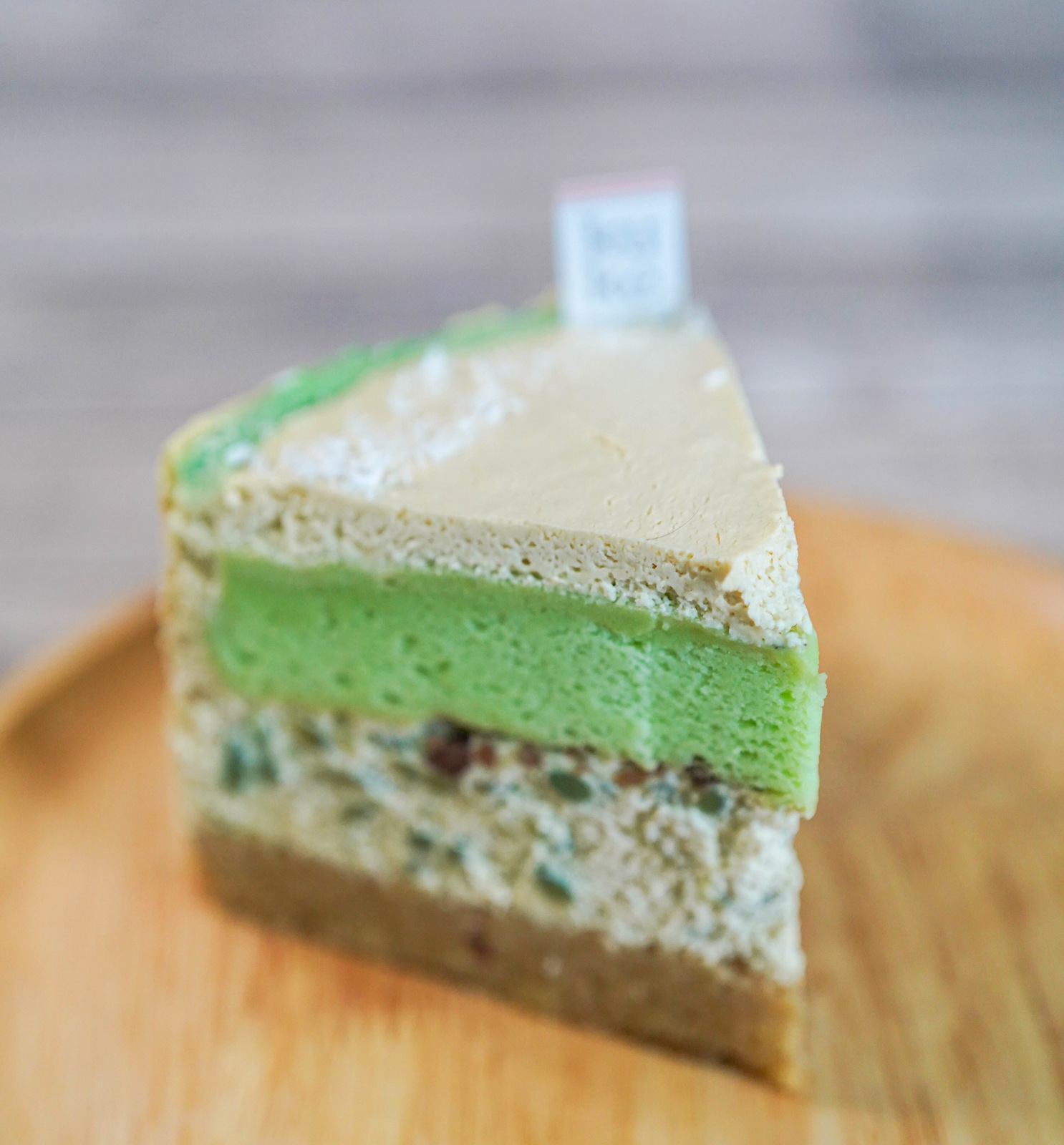 It's the elements of a childhood chilled treat transformed into a tender cake, made textured with smooth, soft green jelly droplets and nutty red beans. Each distinct layer is delightful on its own or together with one another, without tasting artificially flavoured, with a natural aroma that shines pure and clear.