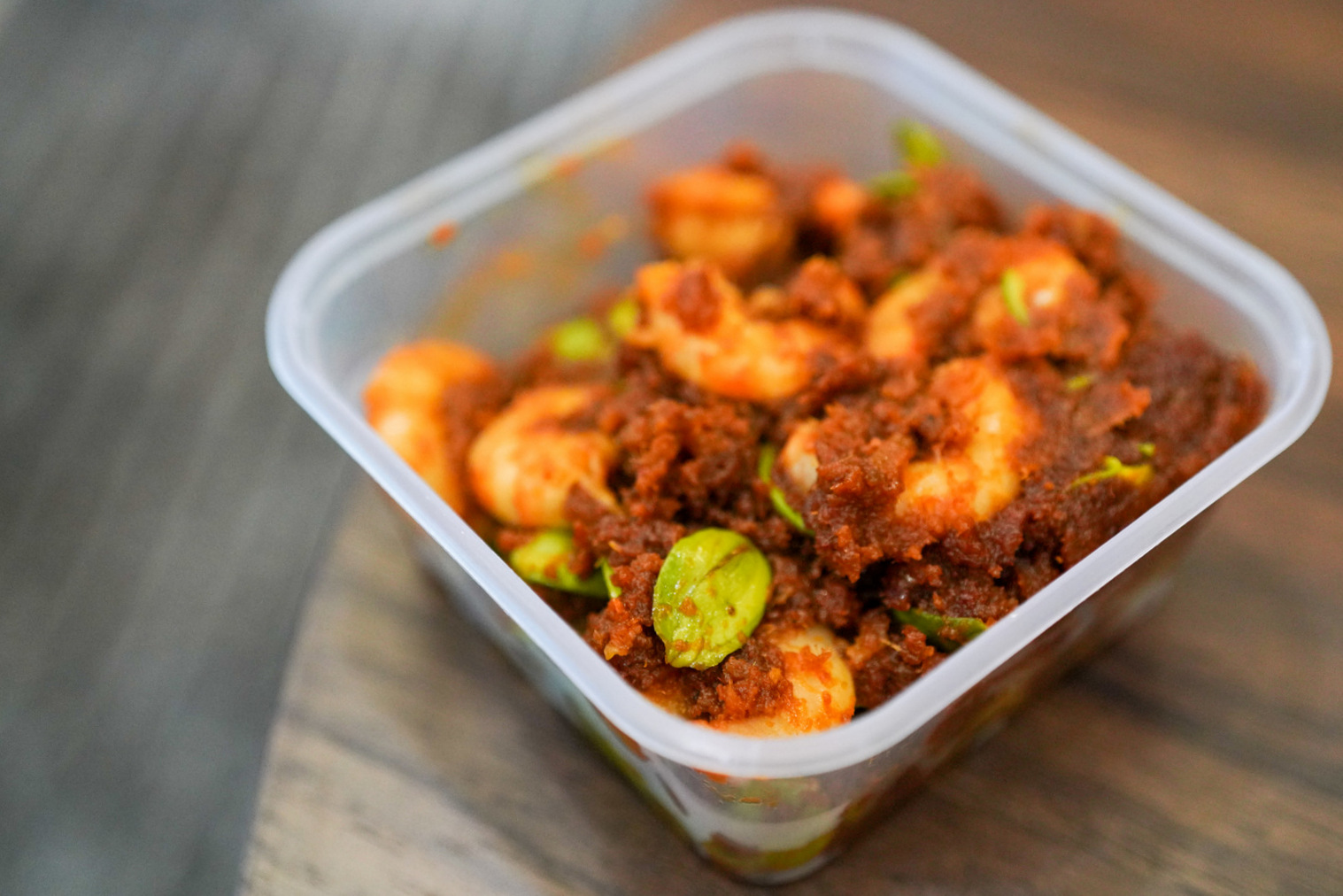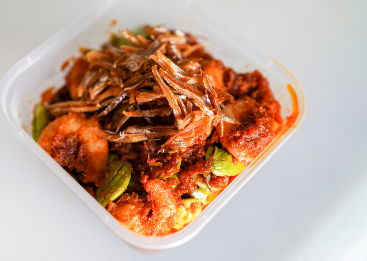 Two people can share a full serving with petai, prawns and ikan bilis (RM25) - you'll only need to pair rice with this, and maybe some cucumbers or other vegetables. Alternatively, you can buy a jar of the sambal alone to use for your own cooking (RM15).