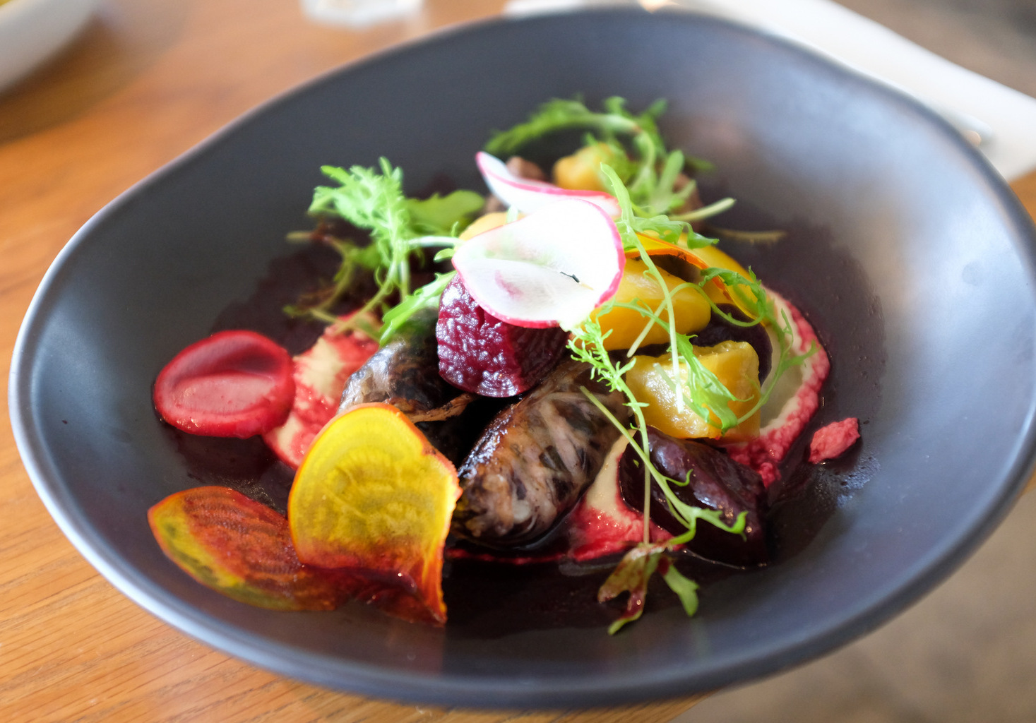 One of our favourite brunches in Auckland: An offal sausage constructed of lamb liver, black pudding & kidney, with beetroot vinegar & white beans; alongside smoked minced fish balls with a pullet egg yolk & tomato green chilli chutney. Inventive fare, with pleasing flavours & perfectly executed textures. A terrific cafe in the tony Parnell suburb.