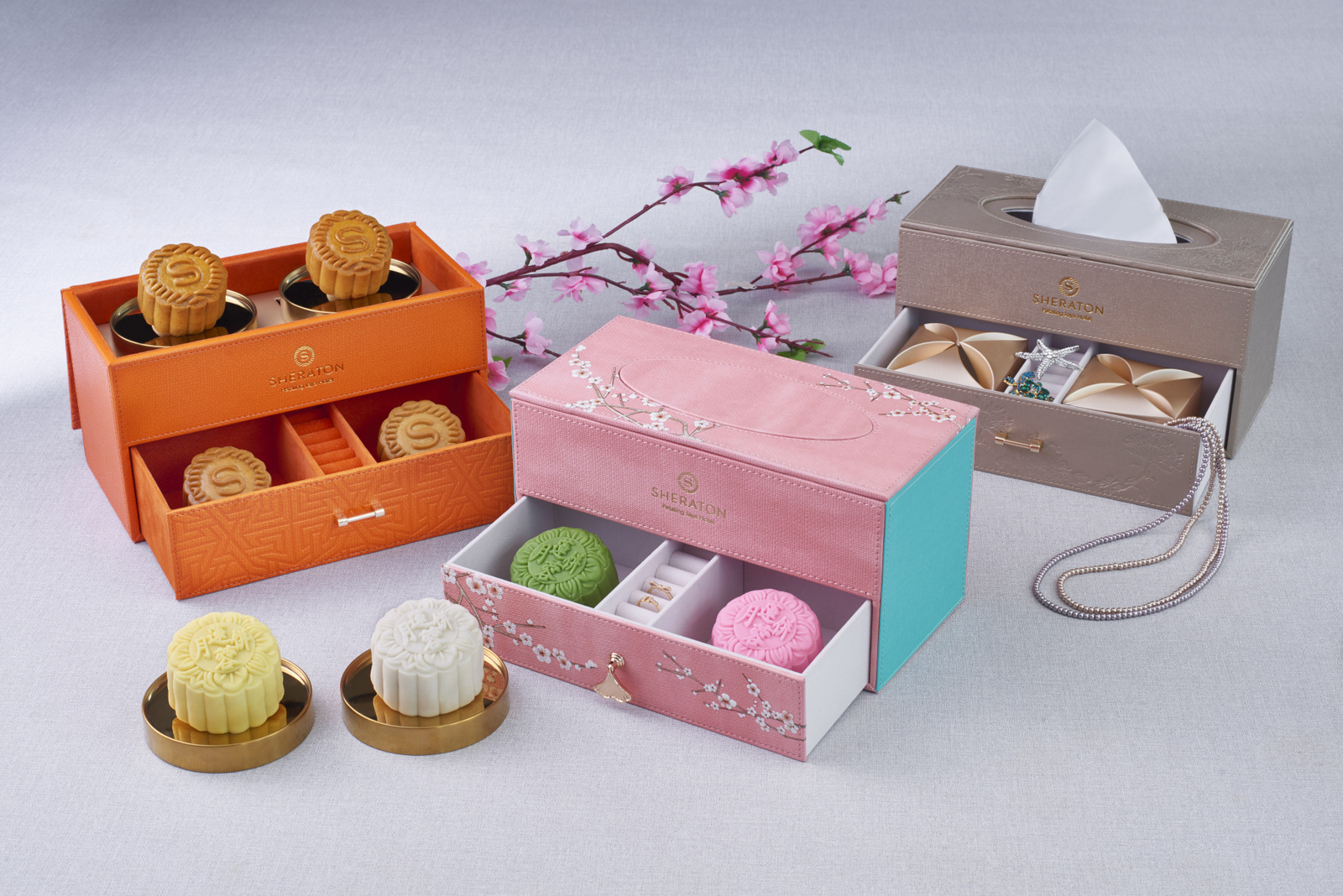 Mooncakes this exquisite deserve special stylish boxes, which come in three possible choices: Pink Blossom, Orange Sapphire, and Moonstone Treasure. The boxes double as jewellery chests and tissue dispensers, making them the ideal gift for family, loved ones and mooncake box collectors.