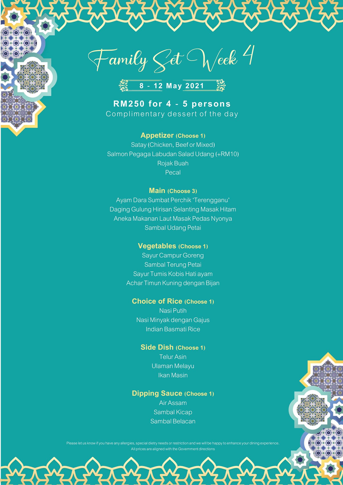 Couples can choose the Take Home Ramadan Menu, crafted for two persons at RM158, from 13 April to 12 May 2021. This menu also includes interesting selections, from Ikan Bawal Tambak Kukus Limau Kasturi to Aneka Makanan Lauk Masak Pedas Nyonya for your main dish and Nasi Bukhari to Nasi Hujan Panas for rice.