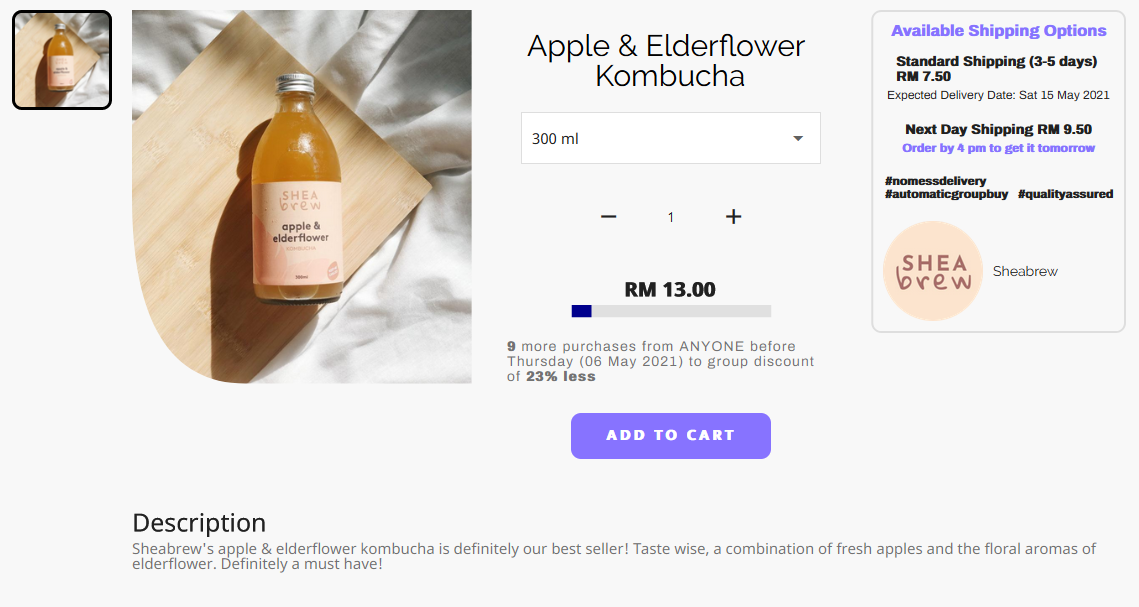 Let's say a bottle of kombucha needs 10 purchases to trigger a 23% discount. If you buy two bottles and other customers buy eight, everyone enjoys the group discount. Simply Better lets you know how near or far you are from the discount, with group purchase prices locked in at 4pm on Mondays and Thursdays.
