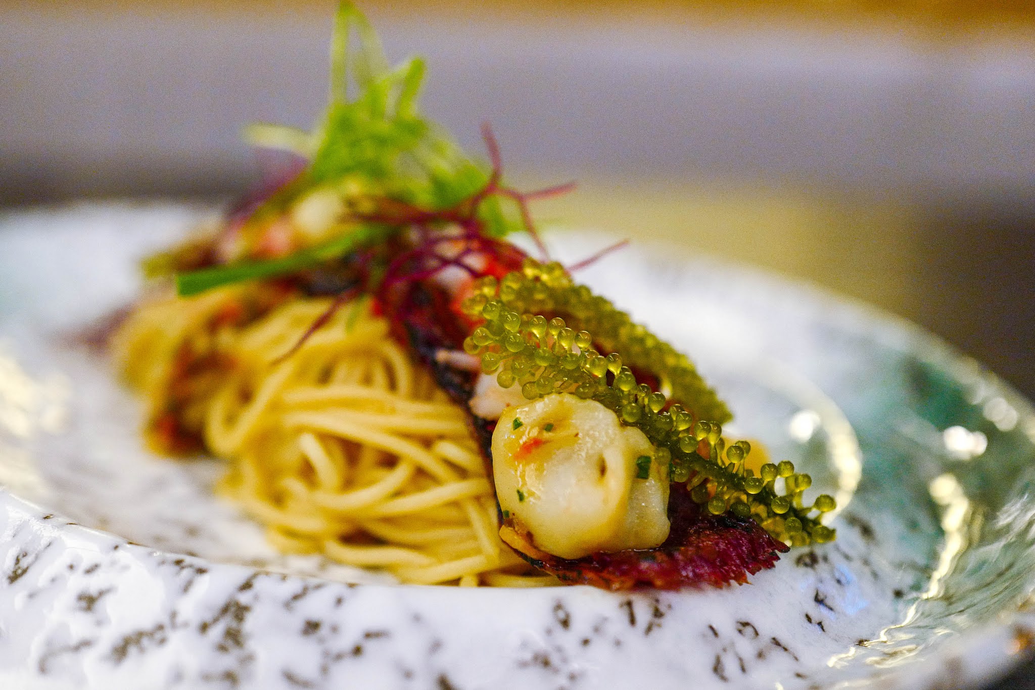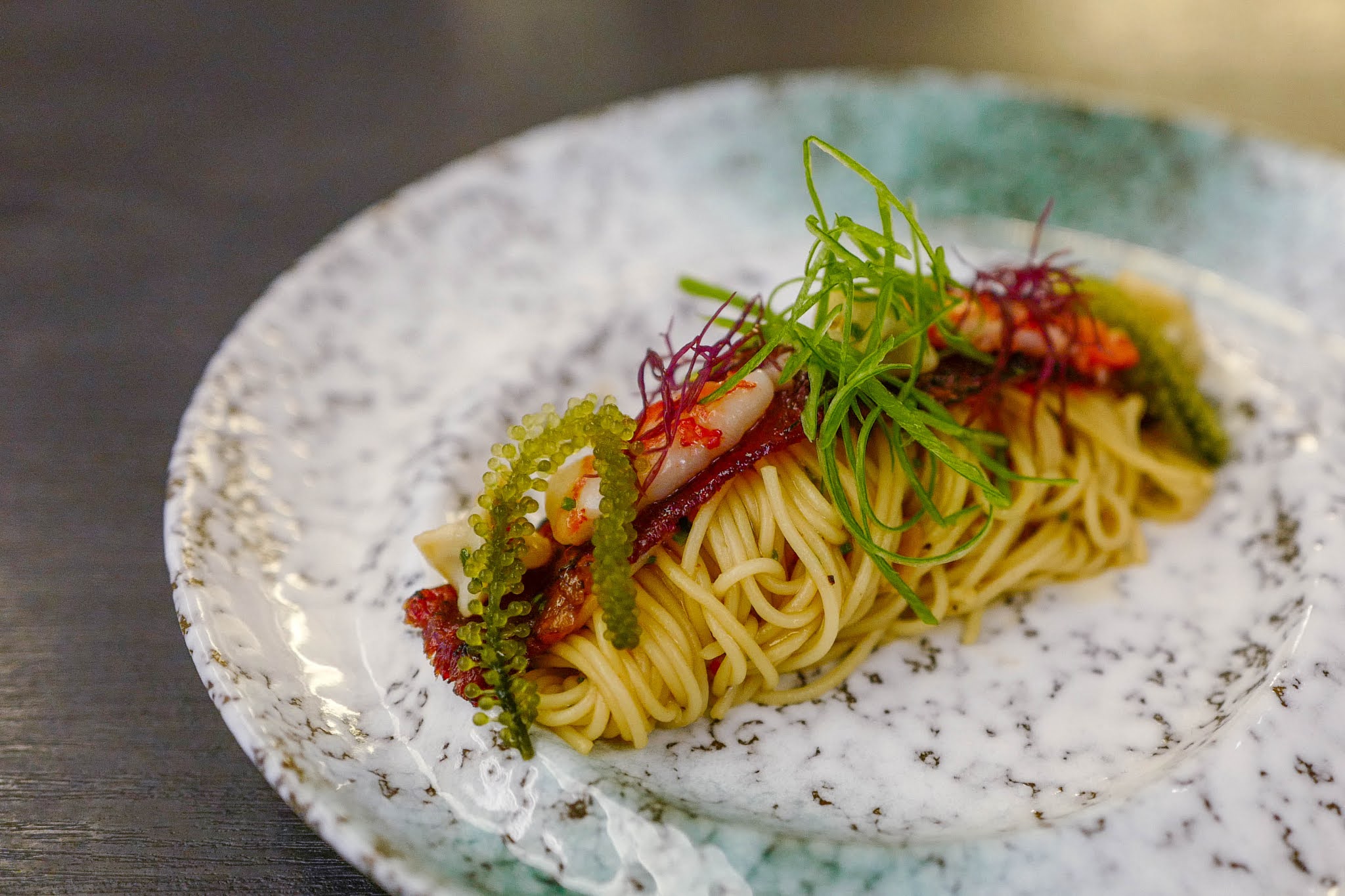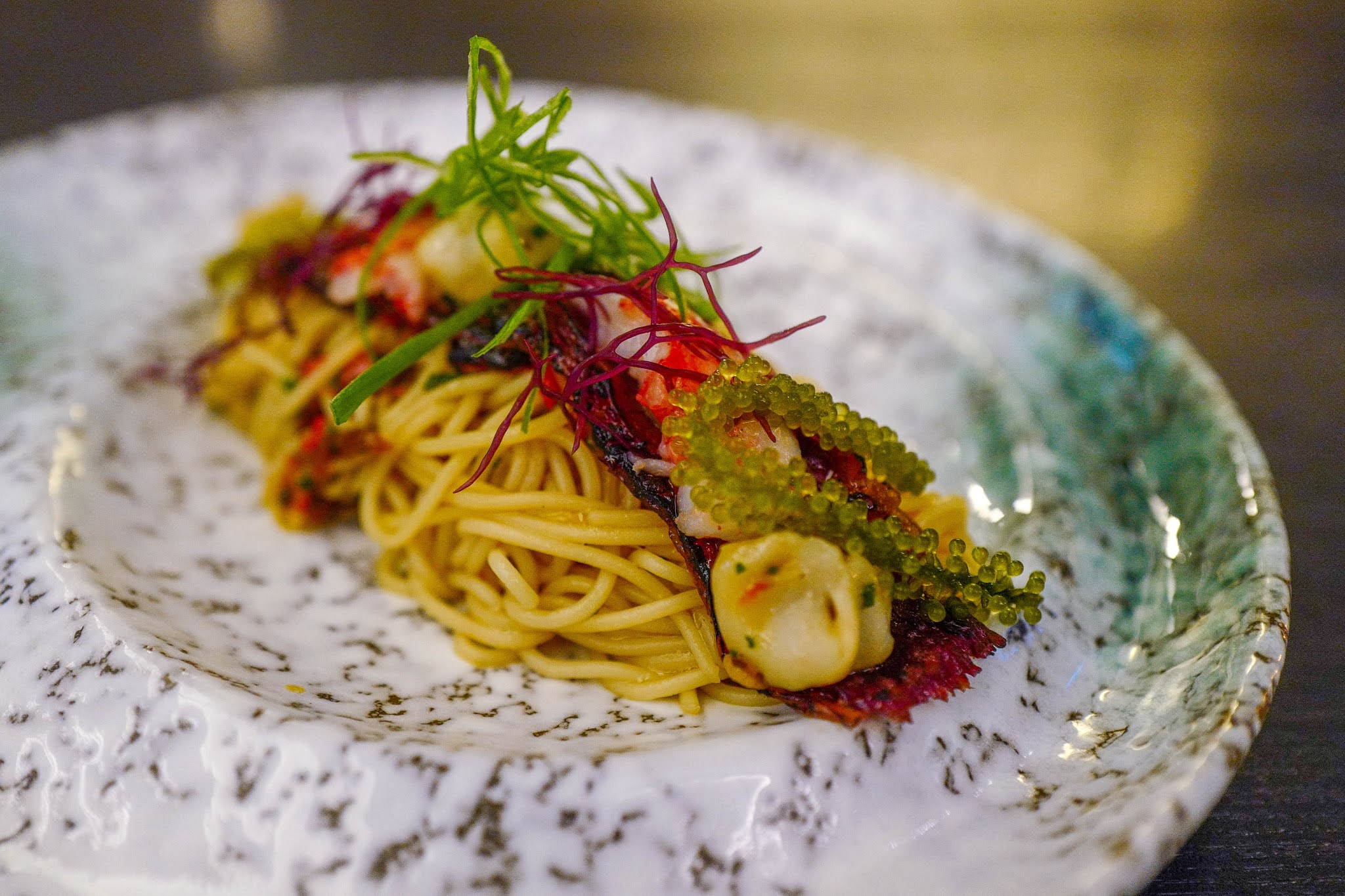 Next up, noodles: Chef Chai harks back to the hometown shop that served his beloved mee kolok with these slick, smooth strands that cushion wagyu karubi 'char siew' and kombu - a luxe remake of a Kuching kopitiam treat, with every component being a playful riff off the ingredients of mee kolok. Ultimately, this is every ounce Chai's own original creation, from the layering of mini beef dumplings to the Carabinero prawns, the allium garnishing to the sprinkle of sea grapes. It's a testament to Chai's talent and imagination that his memories of mee kolok would spark something like this.